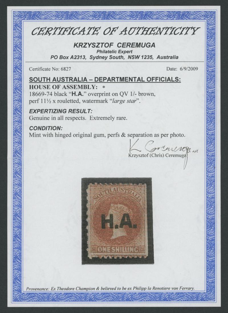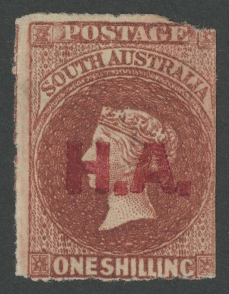 RED OVERPRINT: 'H.A.' on QV Perkins Bacon Large Star Wmk Rouletted 1/- bright red-brown SG DO262, rouletting except at right where