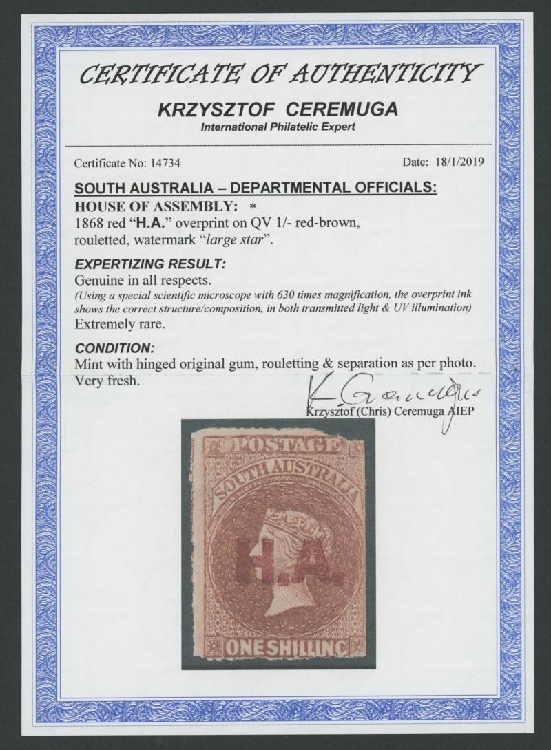 rare...original gum". Lord Vestey's example in bright red-brown sold for £695. Absent from the 'Besancon' and Don Pearce collections, suggesting that it is underrated. (Image1) (Image2)