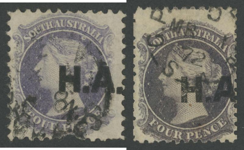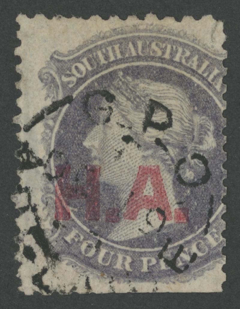 BLACK OVERPRINT: 'H.A.' on QV Perkins Bacon Large Star Wmk Regular Compound Perf 11½-12½ 4d slate-purple SG 268, an unusually tall