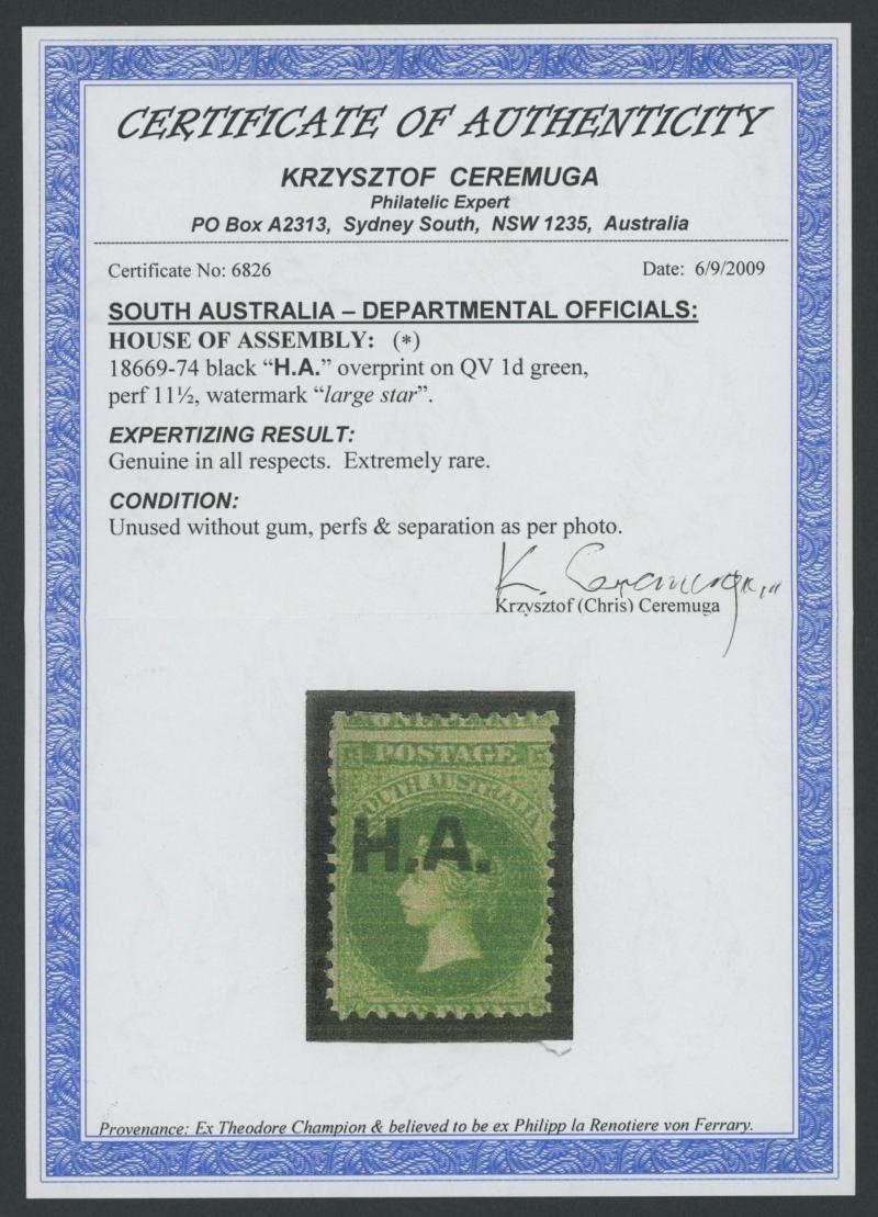 at right well clear of the design, one pulled perf at the base otherwise superb, large-part gum, unpriced unused by Gibbons. Rated RRRR. Ex Baron von Ferrary, Theodore Champion and Philip Croker. Chris Ceremuga Certificate (2009) states "extremely