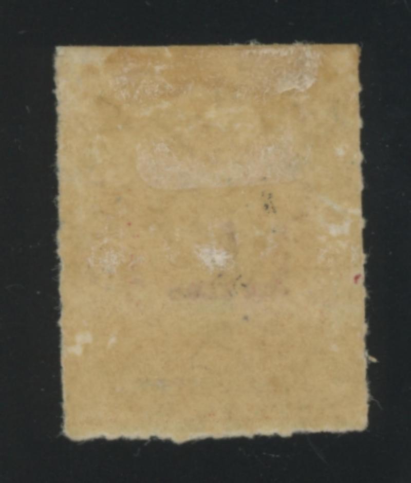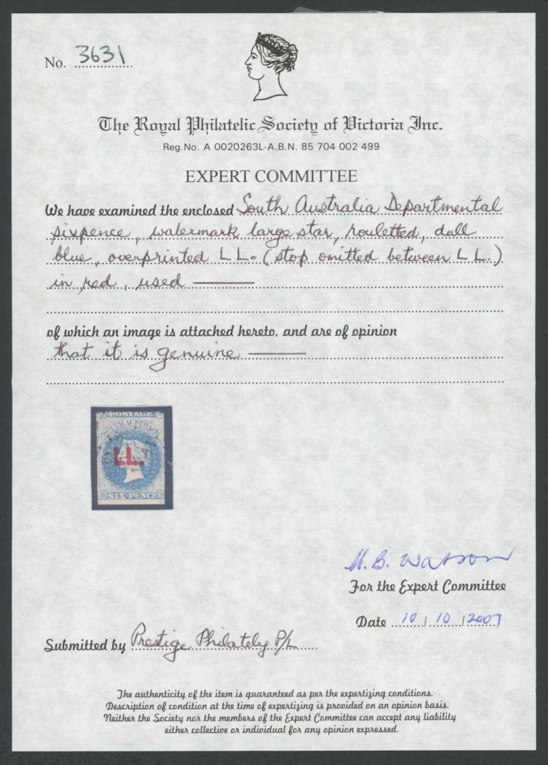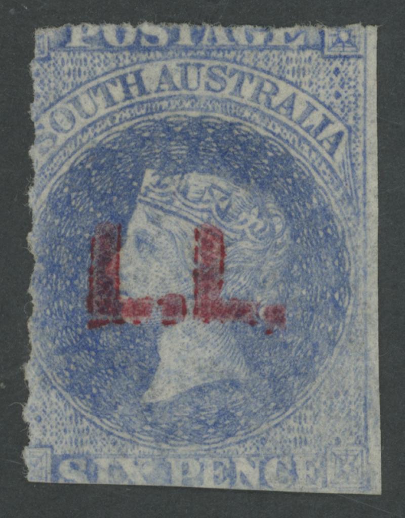 427 F imageRED OVERPRINT: 'LL.' (No Stop between 'LL') on QV Perkins Bacon Large Star Wmk Rouletted 6d ultramarine SG DO306a, rouletting at top & right and cut from the sheet clear of the design at left & base, light indistinct cds, Cat £225. Rated R. Ex Victor Bullock: sold for $845 (Sale 130 Lot 492). RPSV Certificate (2007). The 'Tamiami' example sold for $455 (Sale 236 Lot 633). Don Pearce's example - ironed-out crease - sold for $359 (Sale 247 Lot 445). (Image1) (Image2) (Image3)