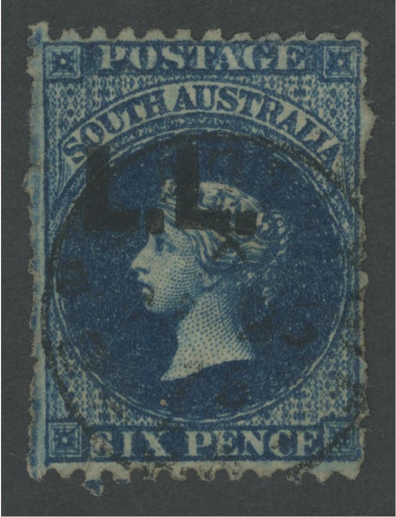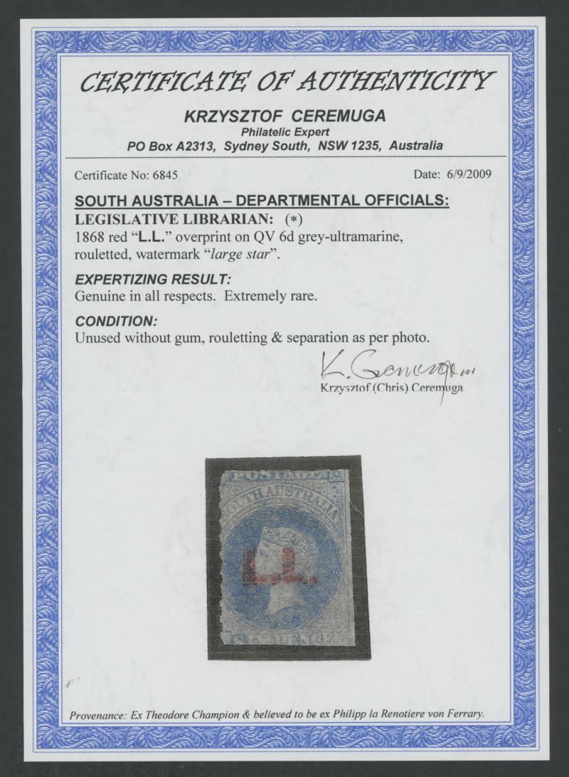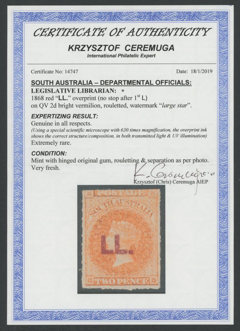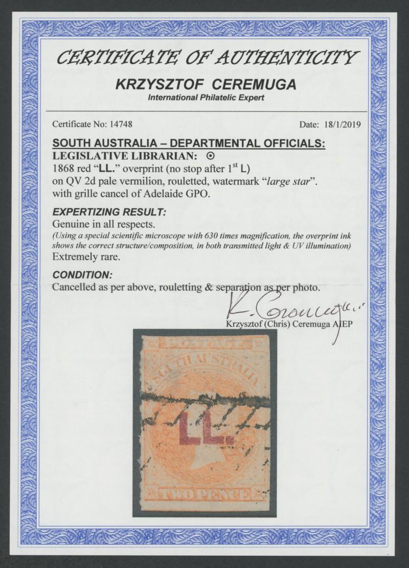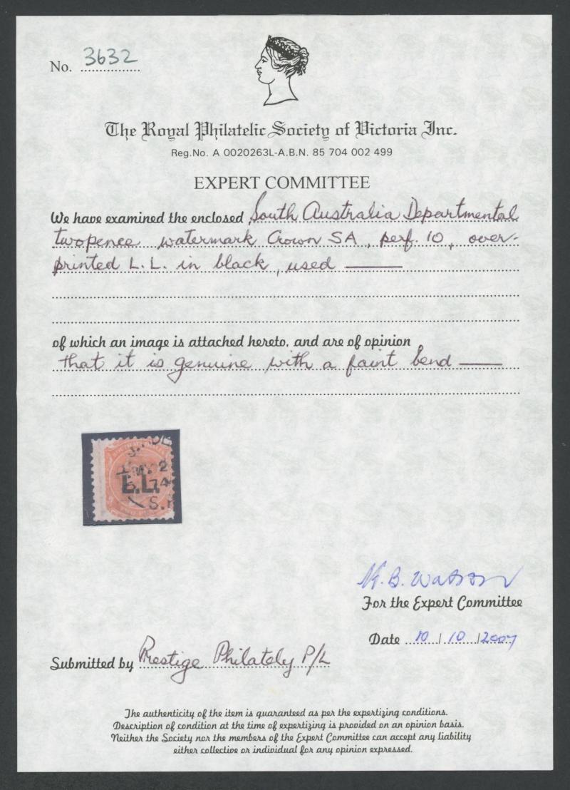 429 F imageBLACK OVERPRINT: 'L.L.' on QV De La Rue Crown/SA Wmk Perf 10 2d deep orange-red SG DO310 with Defective Second 'L', GPO cds of AU25/77. Unlisted by Ron Butler & the only recorded example so, if genuine, it should be rated RRRRRR. Ex Don Pearce: sold for $204 (Sale 247 Lot 447). Offered 'as is'. This stamp is something of an enigma. Compared to other 'L.L.' stamps, the overprint is ½mm shorter & ½mm longer. And the usage is very late. Chris Ceremuga Certificate assessed it as being a forgery. However, the cds appears to be across the overprint, it was found in a multi-generational collection, and it is the only recorded example, which begs the question "Why go to all the trouble of creating a one-off stamp, with an unrecorded variety?" (Image1) (Image2)