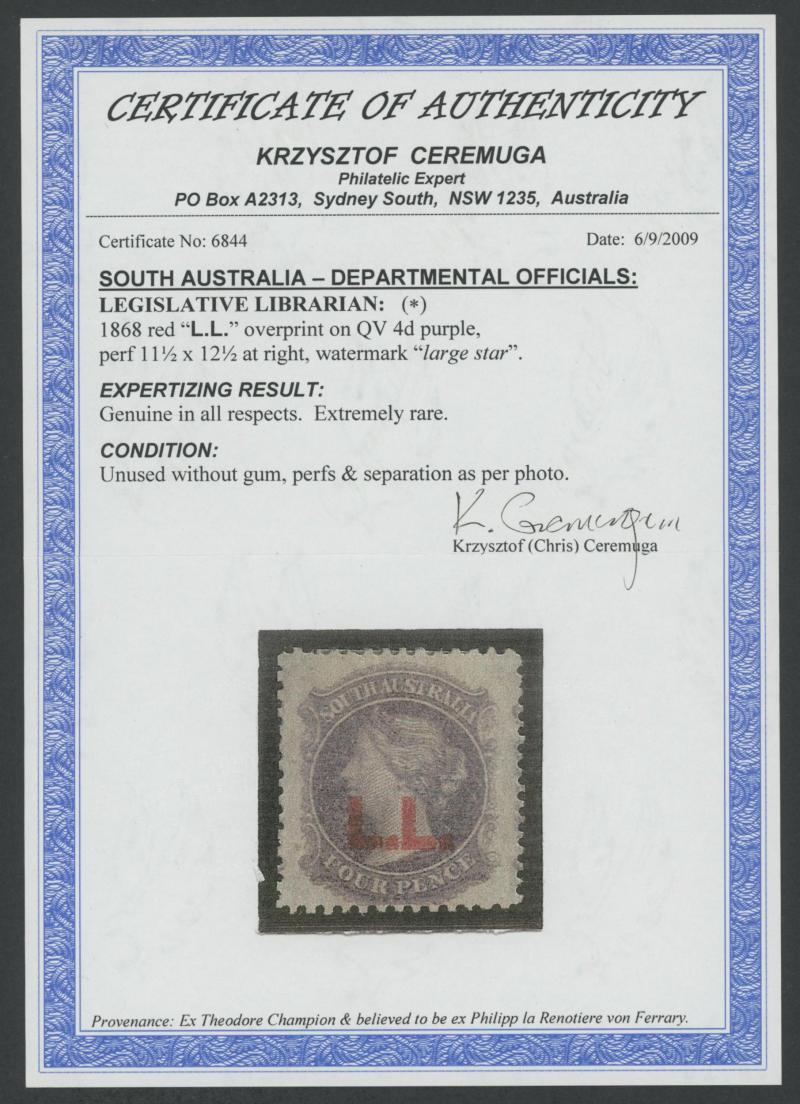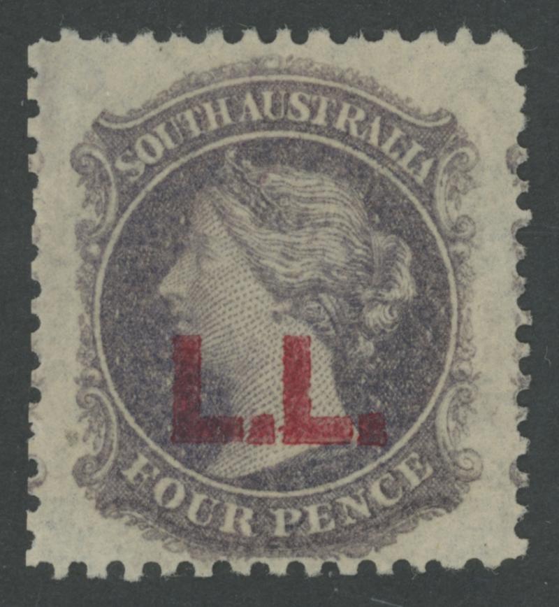423 # imageRED OVERPRINT: 'L.L.' on QV Perkins Bacon Large Star Wmk Perf 11½-12½ 4d slate-purple SG DO30, remarkably well centred, unused, Cat £950. Rated RRRR. Eye candy! Ex Baron von Ferrary, Theodore Champion and Philip Croker. Chris Ceremuga Certificate (2009) states "extremely rare". Superior to the 'Besancon' mint example - trimmed perfs at the top - that sold for SFr1315. Absent from Don Pearce's collection. (Image1) (Image2) (Image3)