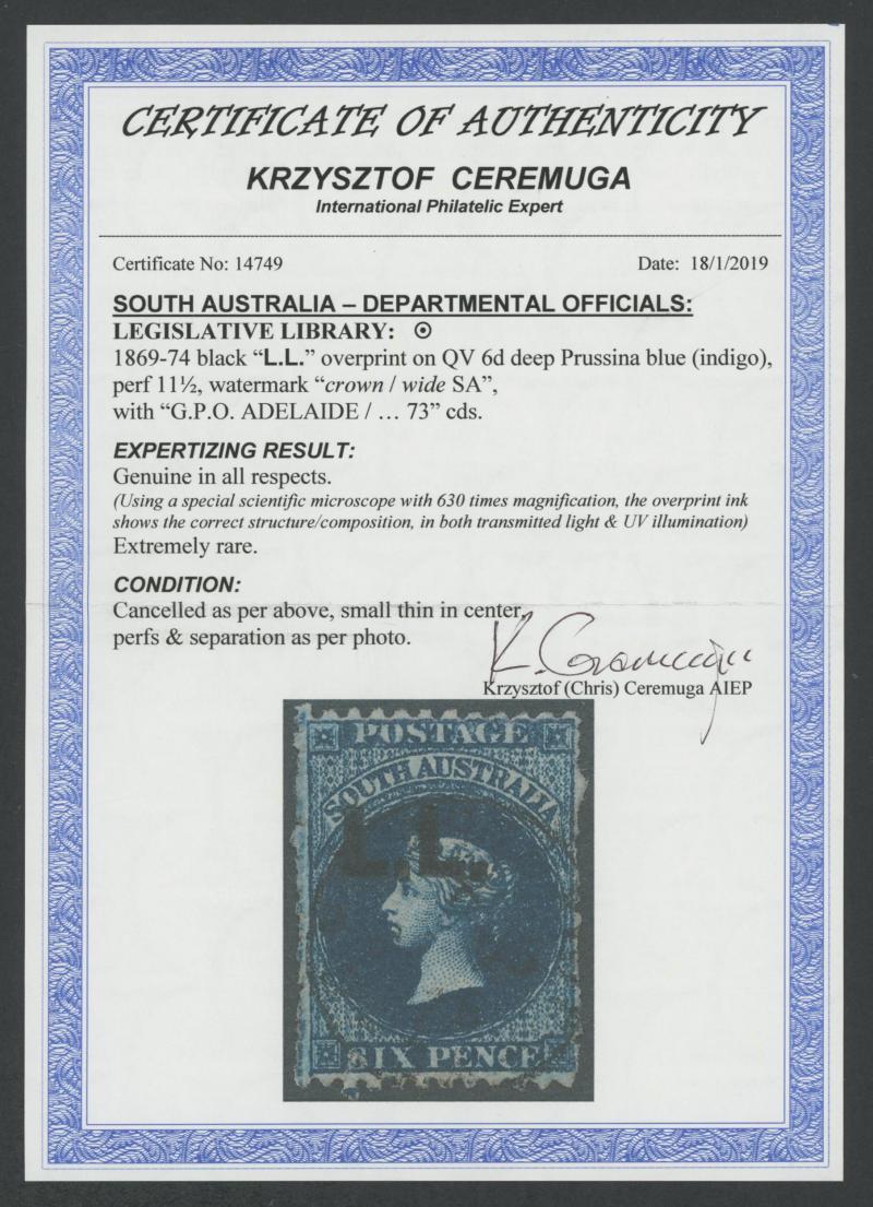 430 F imageBLACK OVERPRINT: 'L.L.' on QV Perkins Bacon Large Star Wmk Perf 11½-12½ 6d Prussian blue SG DO309, remarkably well-centred, irregular perfs at the sides, central shallow thin & a little aged, GPO cds of 1873, Cat £325. Rated RRRR; unrecorded unused. Ex 'Sir Humphrey' (Brian Farmer): sold for $350 (Sale 118 Lot 418). Chris Ceremuga Certificate (2019) states "extremely rare". The 'Tamiami' (Sale 236 Lot 634) and Don Pearce (Sale 247 Lot 444) examples - both graded 'B' - each sold for $599. [Date range -.-.1873 to -.12.1874] (Image1) (Image2) (Image3)