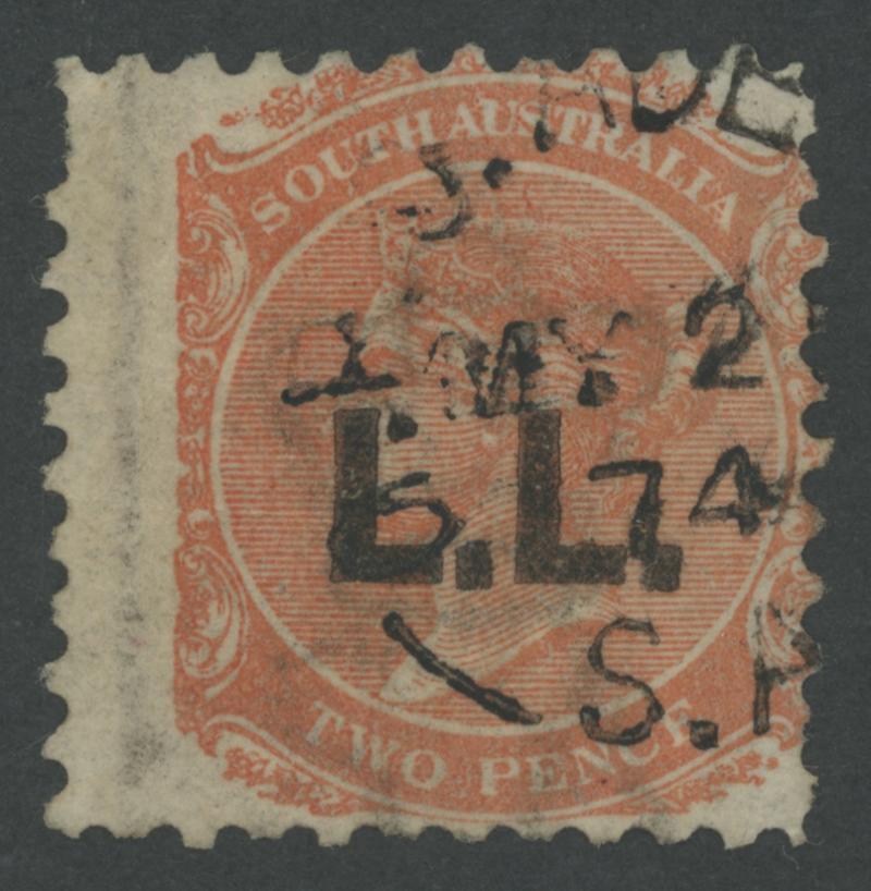 428 F imageBLACK OVERPRINT: 'L.L.' on QV De La Rue Crown/SA Wmk Perf 10 2d deep orange-red SG DO310 large example from the left of the sheet with vertical marginal watermark line at left, one pulled perf at upper-left & a faint bend, GPO cds of 'MY21/74', Cat £650. Rated RRRR; unrecorded unused. Ex Victor Bullock: sold for $785 (Sale 130 Lot 493). RPSV Certificate (2007). Don Pearce's example - ironed-out crease - sold for $895 (Sale 247 Lot 446). Absent from 'Besancon'. [Date range 21.5.1874 to 10.10.1874] (Image1) (Image2) (Image3)