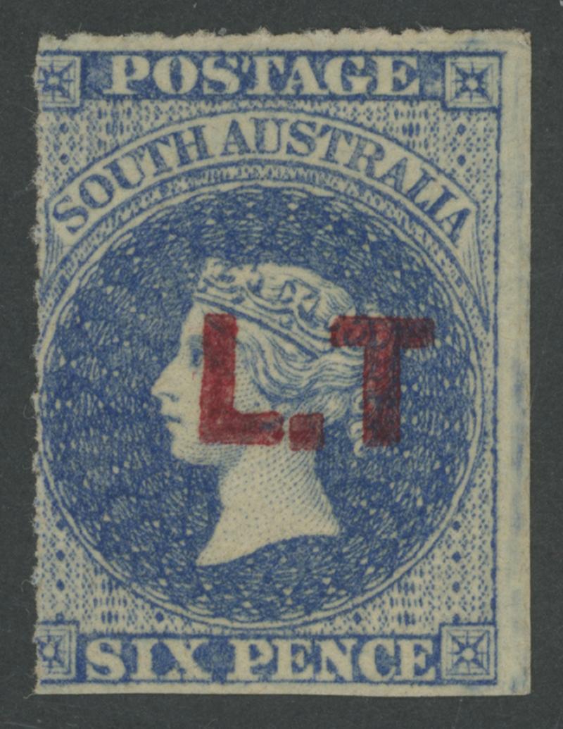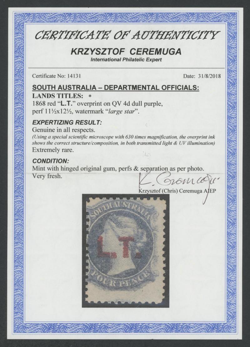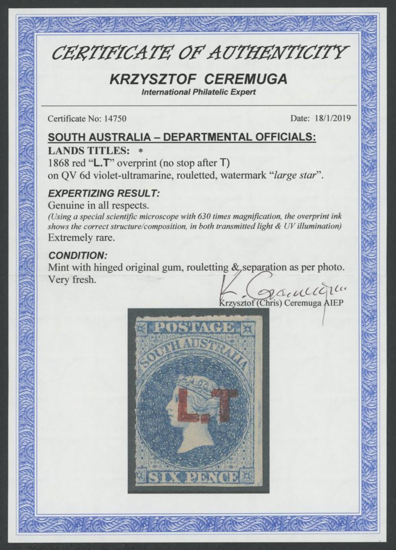 434 og imageRED OVERPRINT: 'L.T ' (No Stop after 'T ') on QV Perkins Bacon Large Star Wmk Rouletted 6d ultramarine SG DO312a, rouletting at top & left and cut from the sheet at base & right well clear of the design, superb large-part gum, Cat £500. Rated RRRR. Superb. Ex Rev James Mursell, Colonel Napier (II) and 'Hamilton'. Chris Ceremuga Certificate (2019) states "extremely rare...original gum". Superior to the Vestey - tiny thin - and 'Besancon' - small separation fault - examples that sold for £1080 and SFr605 respectively. Absent from Don Pearce's collection. (Image1) (Image2) (Image3)