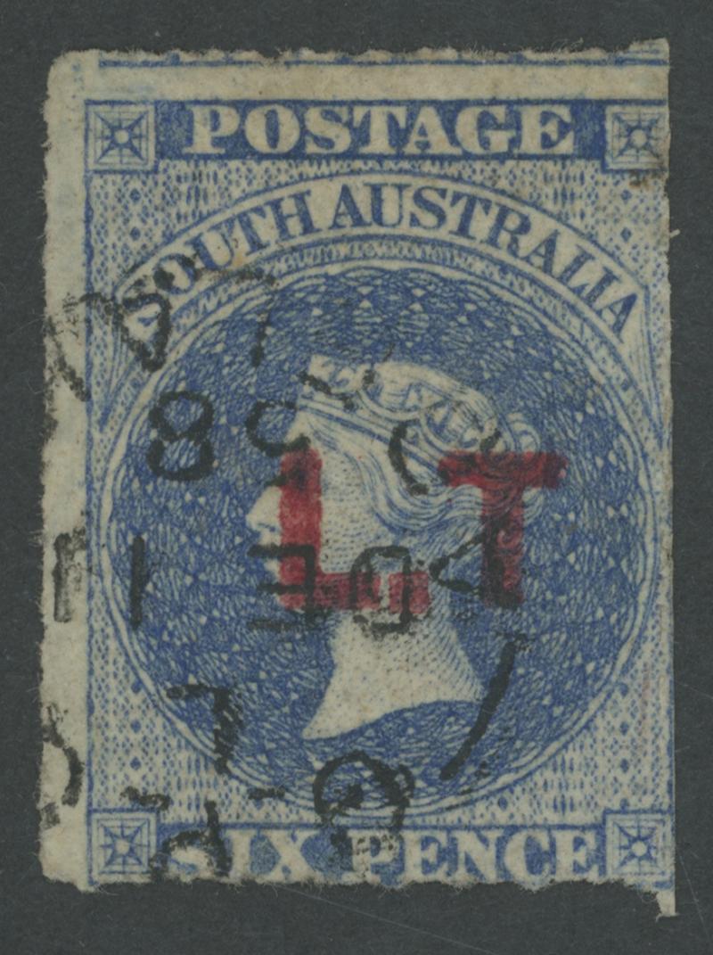 433 F imageRED OVERPRINT: 'L.T.' on QV Perkins Bacon Large Star Wmk Rouletted 6d ultramarine SG DO312, rouletting on all sides, creased at lower-left, superb GPO cds of 'MY9/68', Cat £250. Rated RR. Ex Victor Bullock: sold for $326 (Sale 130 Lot 477). The very fine 'Besancon' and Don Pearce examples sold for SFr340 and $347 (Sale 247 Lot 417) respectively. [Date range 14.4.1868 to 26.3.1869] (Image1) (Image2)