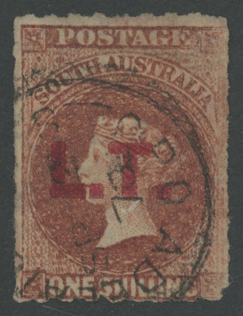 436 og imageRED OVERPRINT: 'L.T.' on QV Perkins Bacon Large Star Wmk Rouletted 1/- bright red-brown SG DO313, rouletting on all sides clear of the design except at left, large-part gum, Cat £600. Rated RRR. Ex Rev James Mursell and Colonel Napier (II). The similar 'Besancon' example sold for SFr485. Absent from Don Pearce's collection. (Image1) (Image2)