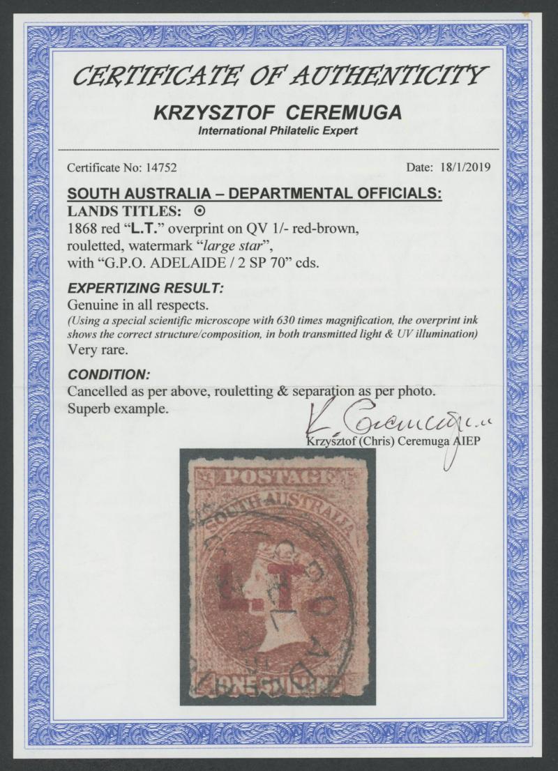 437 F imageRED OVERPRINT: 'L.T.' on QV Perkins Bacon Large Star Wmk Rouletted 1/- bright red-brown SG DO313, rouletting on all sides, light GPO cds of 'SP2/73' (Misaligned Date Slugs), Cat £600. Rated RRRR. Ex Victor Bullock: sold for $349 (Sale 130 Lot 479). Chris Ceremuga Certificate (2019) states "very rare...superb". Superior to the 'Besancon' example - a couple of minor separation faults - that sold for SFr266. Don Pearce's very fine example sold for $455 (Sale 247 Lot 419). [Date range 7.6.1871 to 28.7.1874] (Image1) (Image2) (Image3)