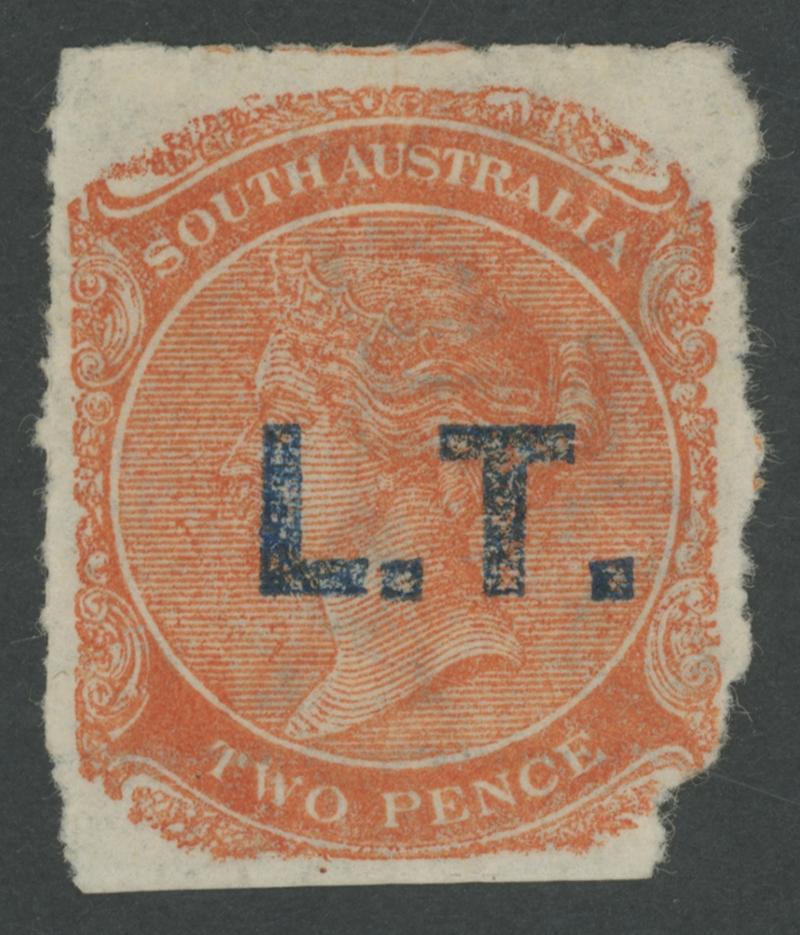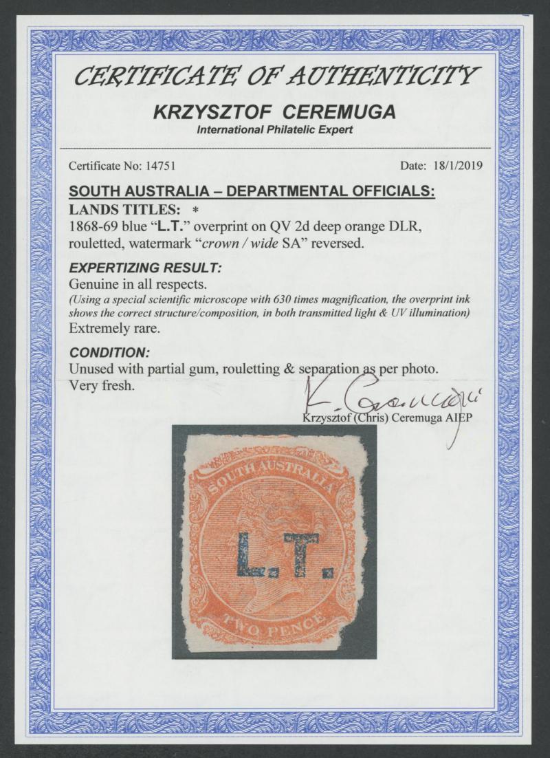 438 og imageBLUE OVERPRINT: 'L.T.' on QV De La Rue Wmk Rouletted 2d deep orange SG DO315, rouletting on all sides, separation faults at lower-right, part-gum, Cat £850. Rated RRRR. Chris Ceremuga Certificate (2009) states "extremely rare". The very fine 'Besancon' example sold for SFr1150. The Don Pearce example - small separation fault - sold for $550 (Sale 247 Lot 420). (Image1) (Image2) (Image3)