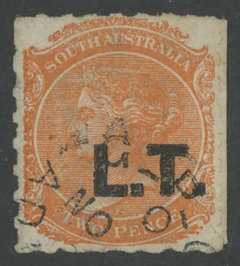 440 V imageBLACK OVERPRINT: 'L.T.' on QV De La Rue Crown/SA Wmk Rouletted 2d red-orange SG DO316 with the Watermark Reversed, rouletting on all sides & cut from the sheet at right well clear of the design, part-GPO cds, Cat £120+. Rated RR+; unrecorded unused. Superb. Superior to Don Pearce's example that sold for $190 (Sale 247 Lot 422). [Date range 4.6.1870 to 15.4.1874] (Image1) (Image2)