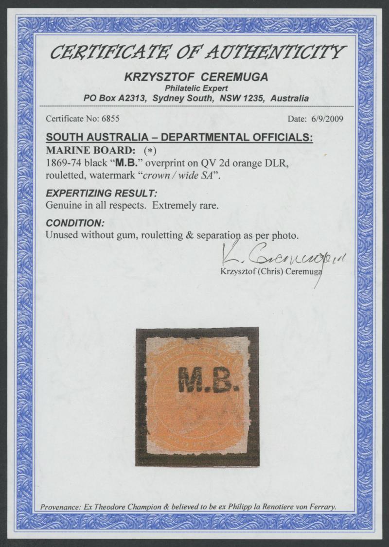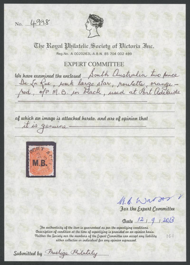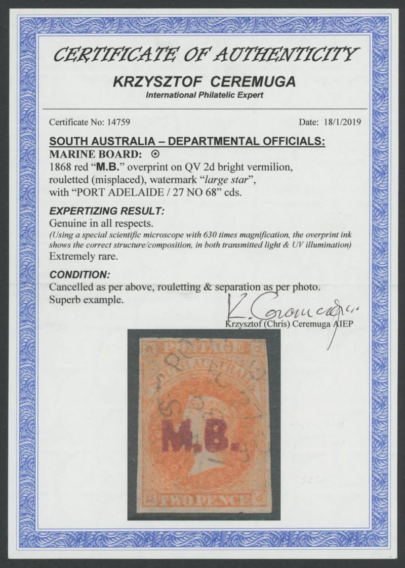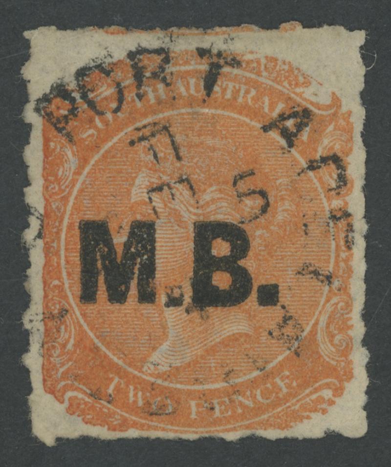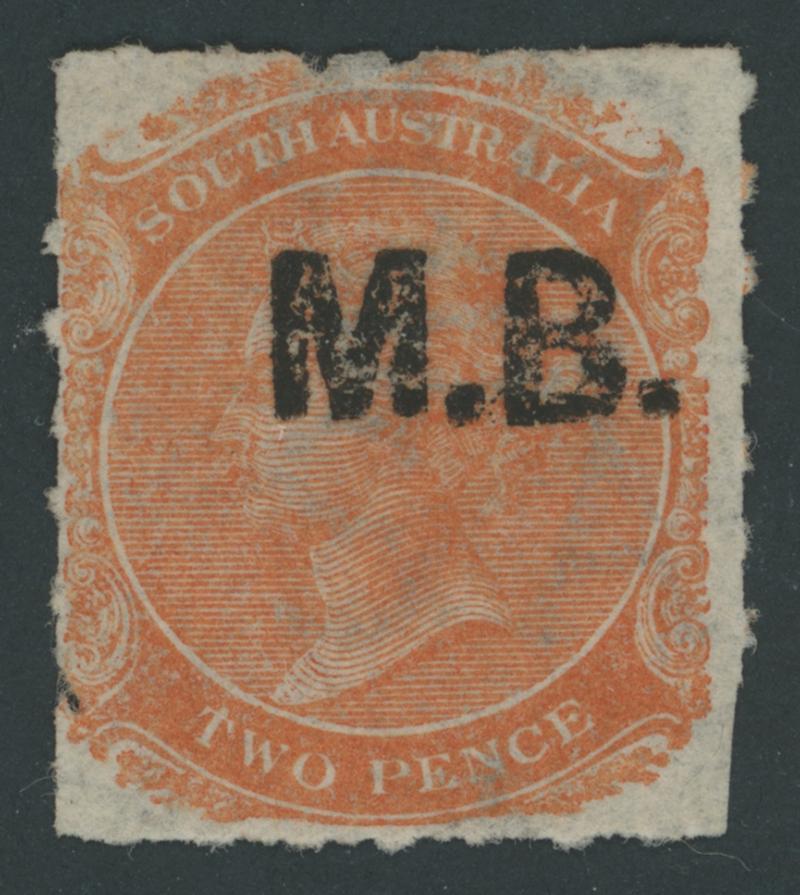 BLACK OVERPRINT: 'M.B.' on QV De La Rue Large Star Wmk Rouletted 2d red-orange SG DO338a, rouletting on all sides, Port Adelaide