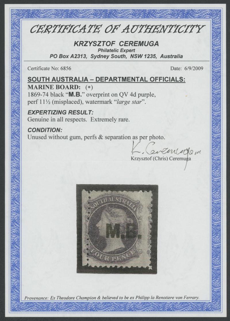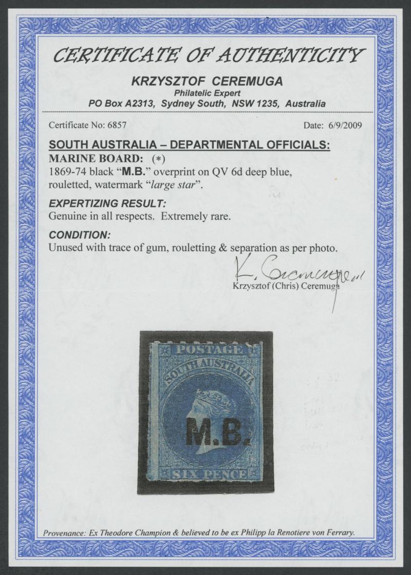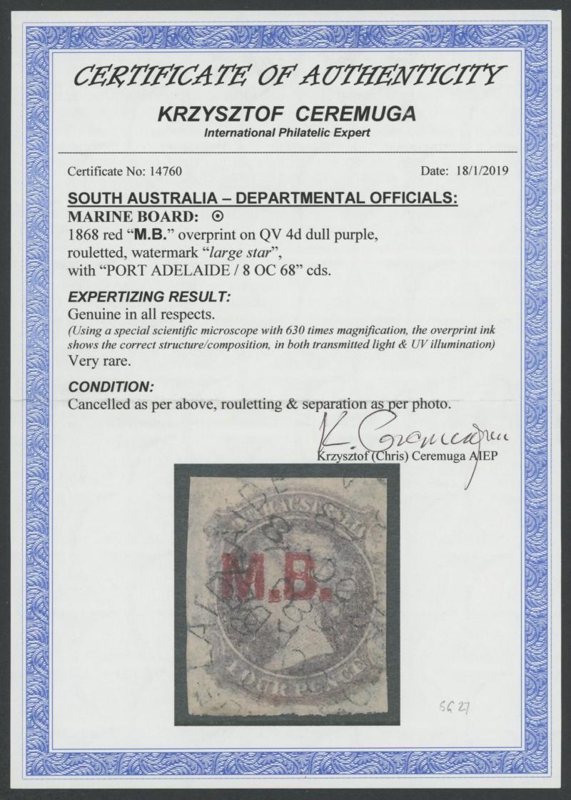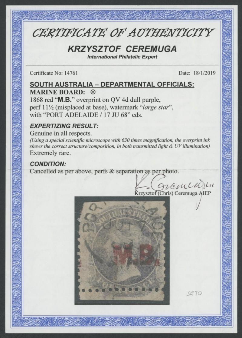 imperforate and cut from the sheet on all sides to largely preserve the design (just touched at right), Port Adelaide cds of 'OC8/68', Cat £650. Rated RRRR. Ex 'Sir Humphrey' (Brian Farmer): sold for $350. Chris Ceremuga Certificate (2019) states