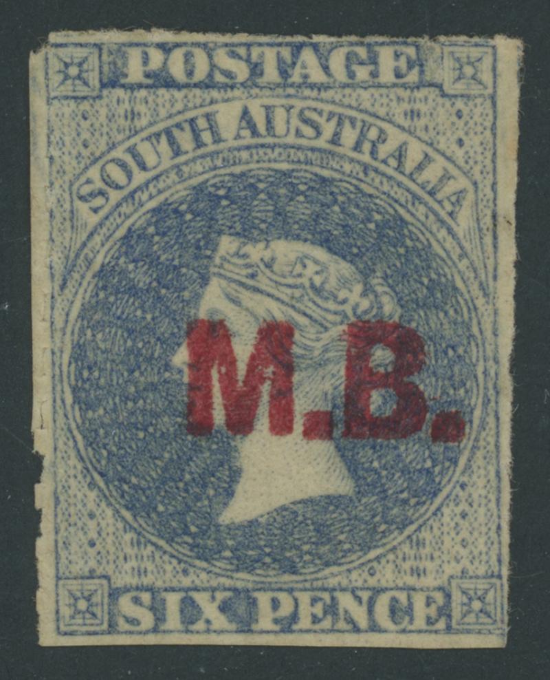RED OVERPRINT: 'M.B.' on QV Perkins Bacon Large Star Wmk Rouletted 6d dull ultramarine SG DO334, rouletting except at the top where