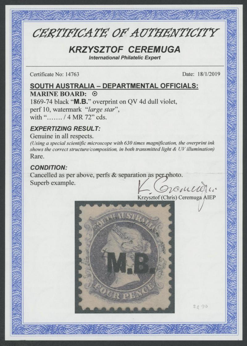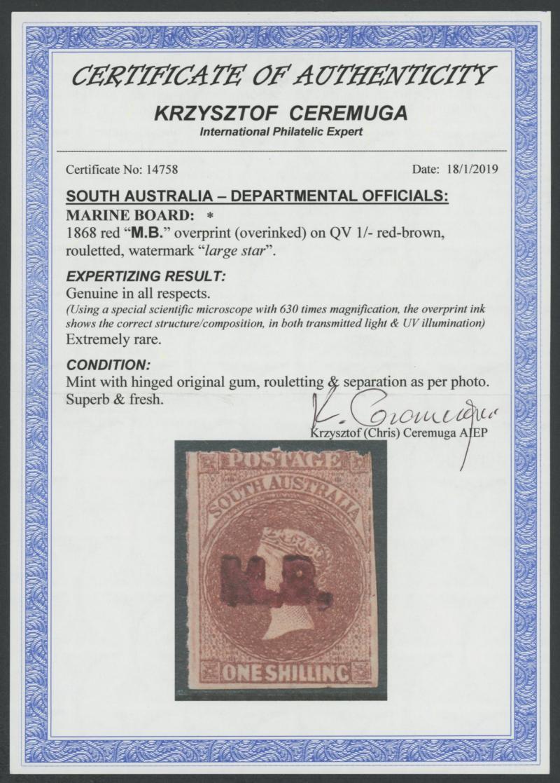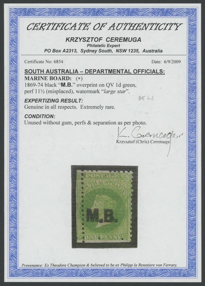 the entire series are both for the Marine Board, this stamp with 'I M.B.' and the 1d with 'M.B. :' see Lot 469. Ex Don Pearce: sold for $1375 (Sale 247 Lot 507). (Image1) (Image2)