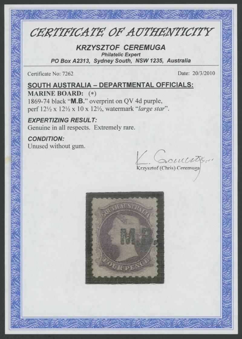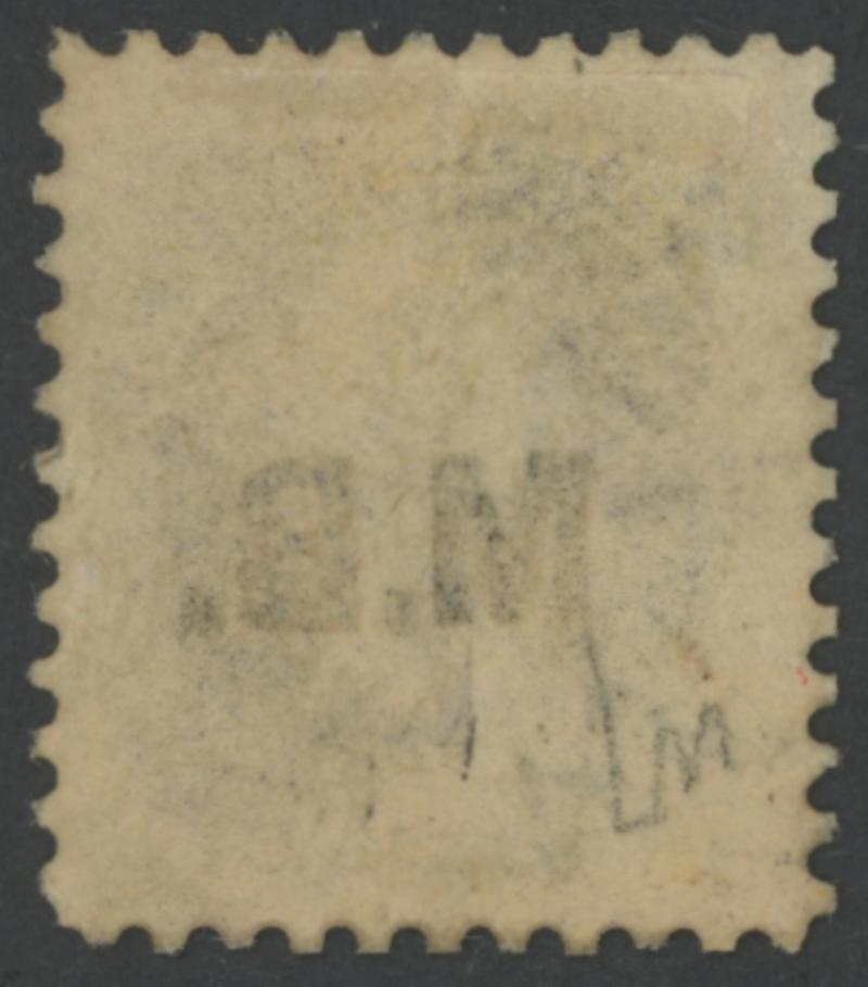 It is remarkable that the only such typesetting errors recorded in the entire series are both for the Marine Board, this stamp with 'M.B. :', and the 4d with 'I M.B.': see Lot 475. (Image1) (Image2)