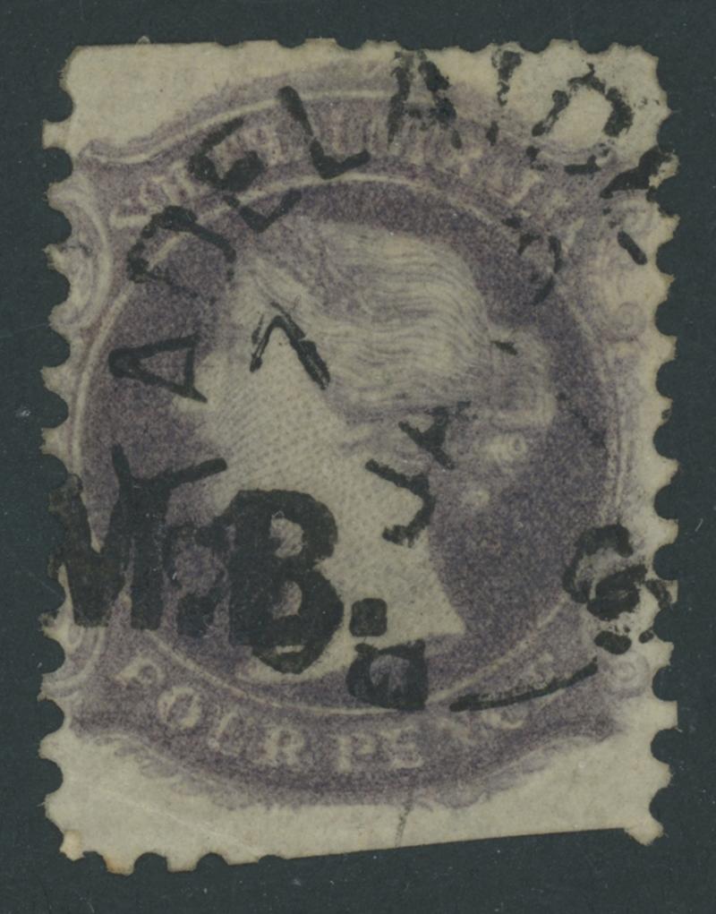 cut from the sheet to preserve the design, Port Adelaide cds of 'MY23/68', Cat £130. Rated R. Don Pearce's superb example sold for $179 (Sale 247 Lot 495). [Date range 23.5.1868 to 23.5.1869] (Image1) (Image2)