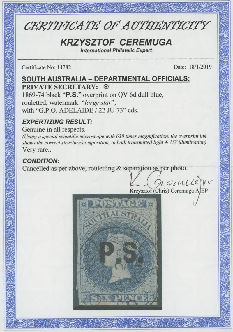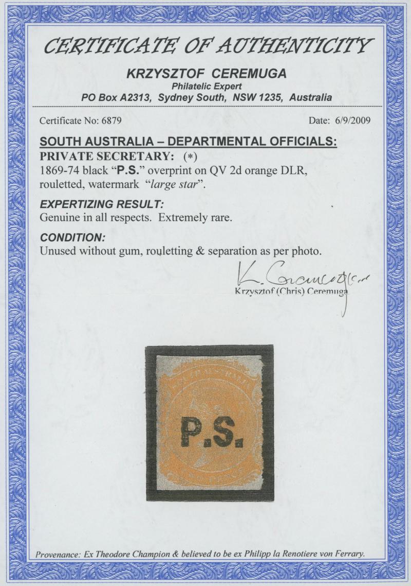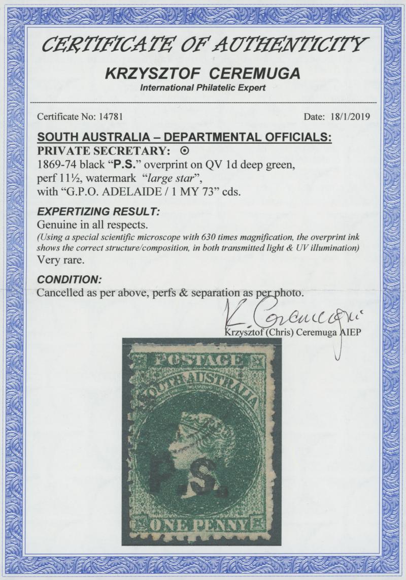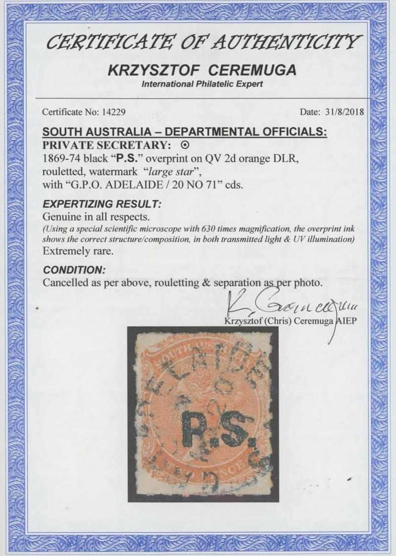 PO/JY15/71S AUSTRALIA' cds, Cat £200; and Perf 10 SG DO444, partial 'ROBE' cds, Cat £140. Rated RR and R. Don Pearce's similar duo sold for $600 (Sale 247 Lots 609 & 610). [Apart from the Northern Territory ('N.T.'), this was the only user to which