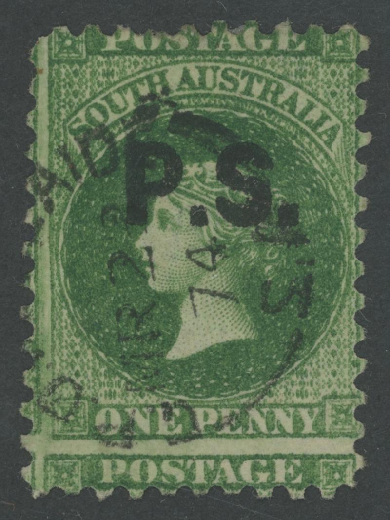 BLACK OVERPRINT: 'P.S.' on QV Perkins Bacon Large Star Wmk Perf 11½-12½xRouletted 1d deep yellow-green SG DO433, small separation