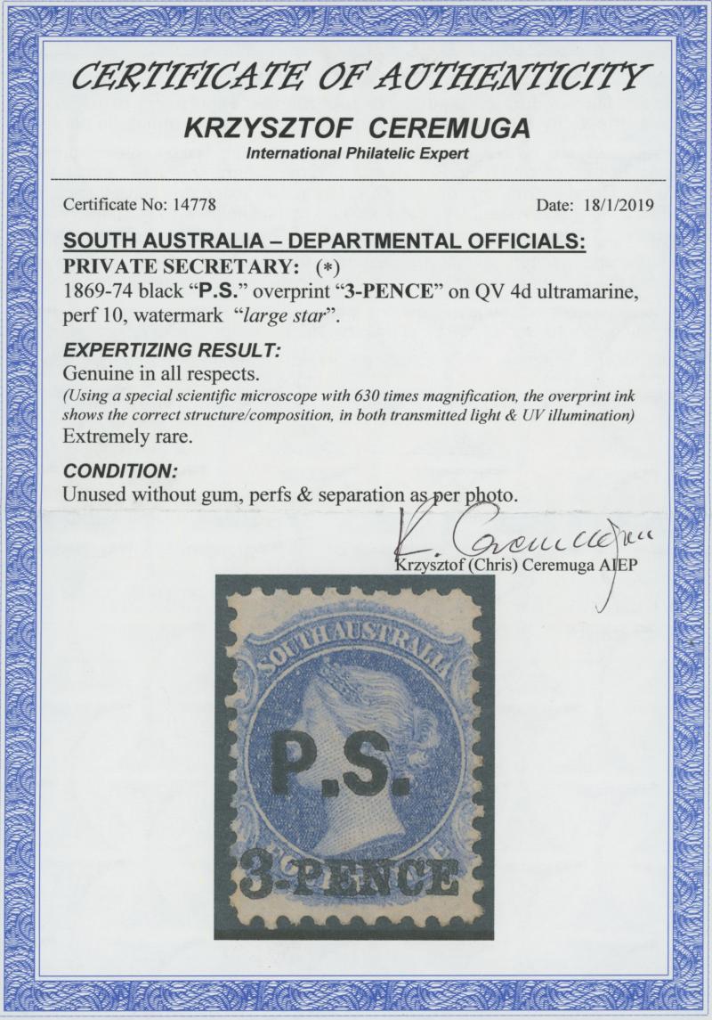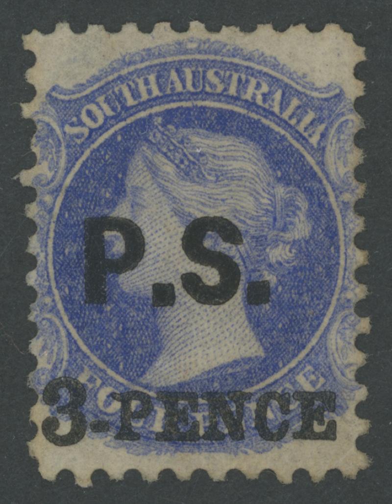 BLACK OVERPRINT: 'P.S.' on QV Perkins Bacon Large Star Wmk Perf 10 '3-PENCE' in Black on 4d ultramarine SG DO444, unused, Cat £650.