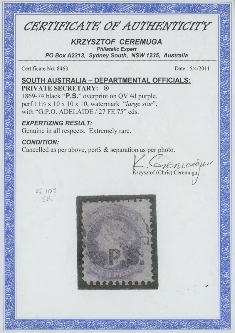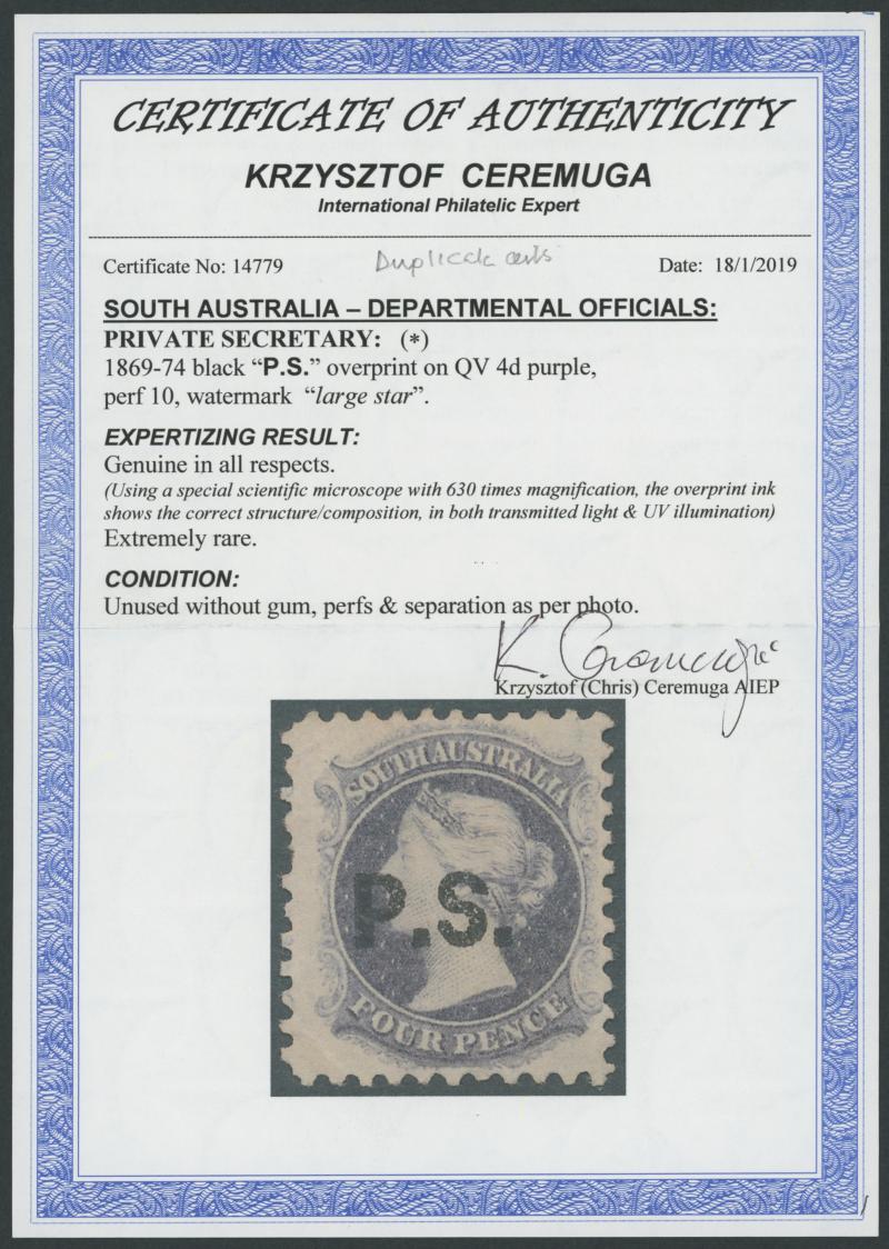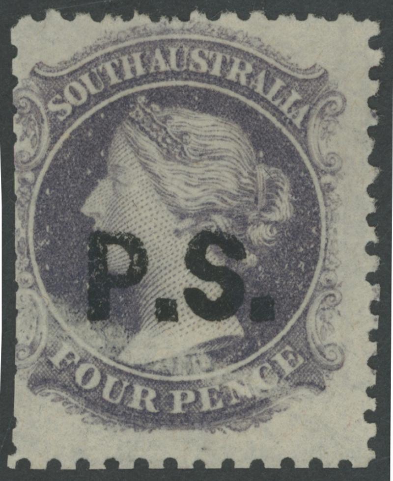 BLACK OVERPRINT: 'P.S.' on QV Perkins Bacon Large Star Wmk Irregular Compound Perf 11½-12½x10x10x10 4d dull violet SG DO447, GPO