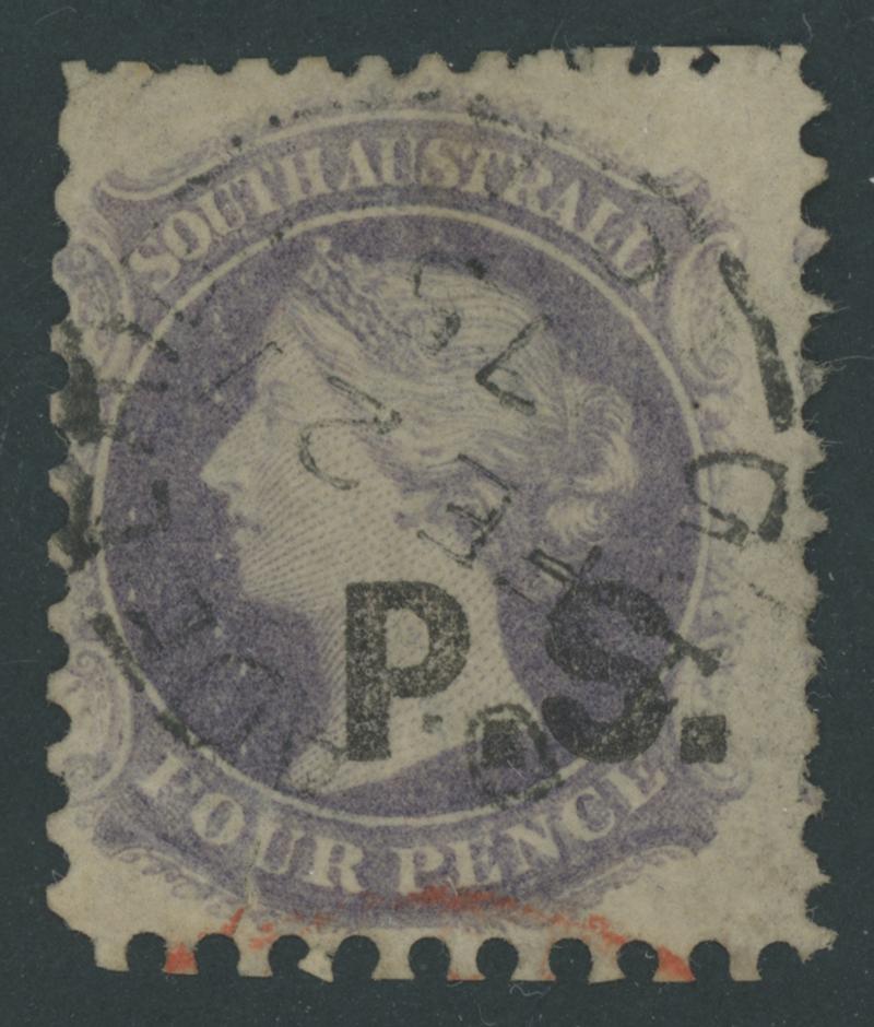 BLACK OVERPRINT: 'P.S.' on QV Perkins Bacon Large Star Wmk Perf 11½-12½ 4d deep violet SG DO438, unusual diagonal 'Comet Flaw'