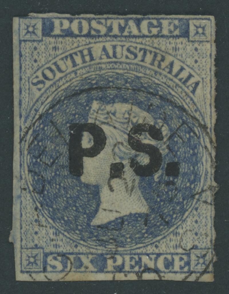 BLACK OVERPRINT: 'P.S.' on QV Perkins Bacon Large Star Wmk Perf 11½-12½xRouletted 6d Prussian blue SG DO434, horizontal perfs