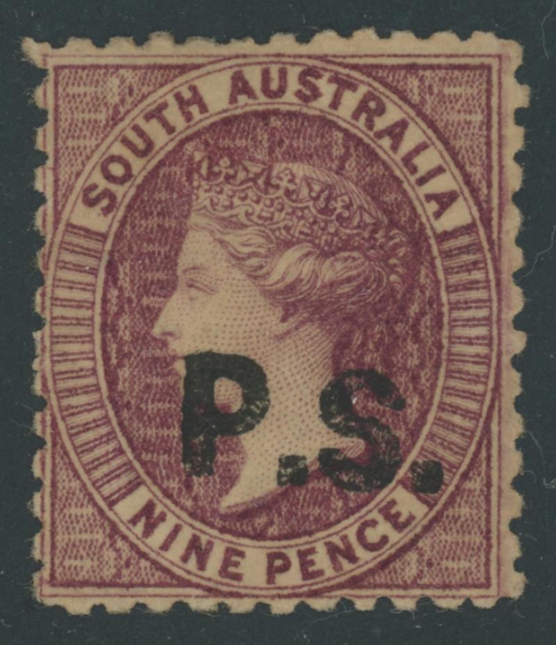 BLACK OVERPRINT: 'P.S.' on QV Perkins Bacon Large Star Wmk Perf 11½-12½ 9d red-purple SG DO440, unusually well-centred, large-part