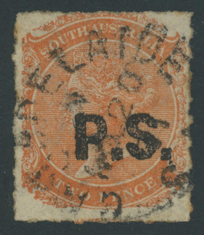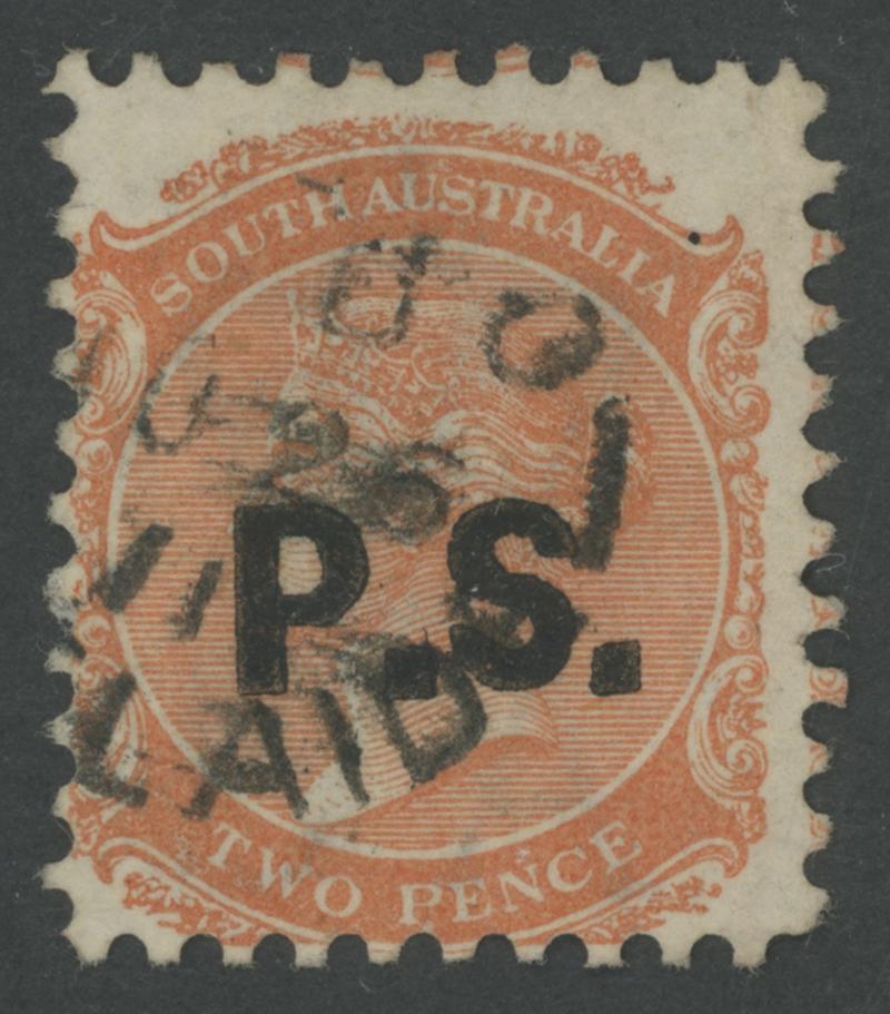 BLACK OVERPRINT: 'P.S.' on QV De La Rue Crown/SA Wmk 2d dull orange SG DO442, GPO cds of 'JU26/71', Cat £120. Rated R; unrecorded