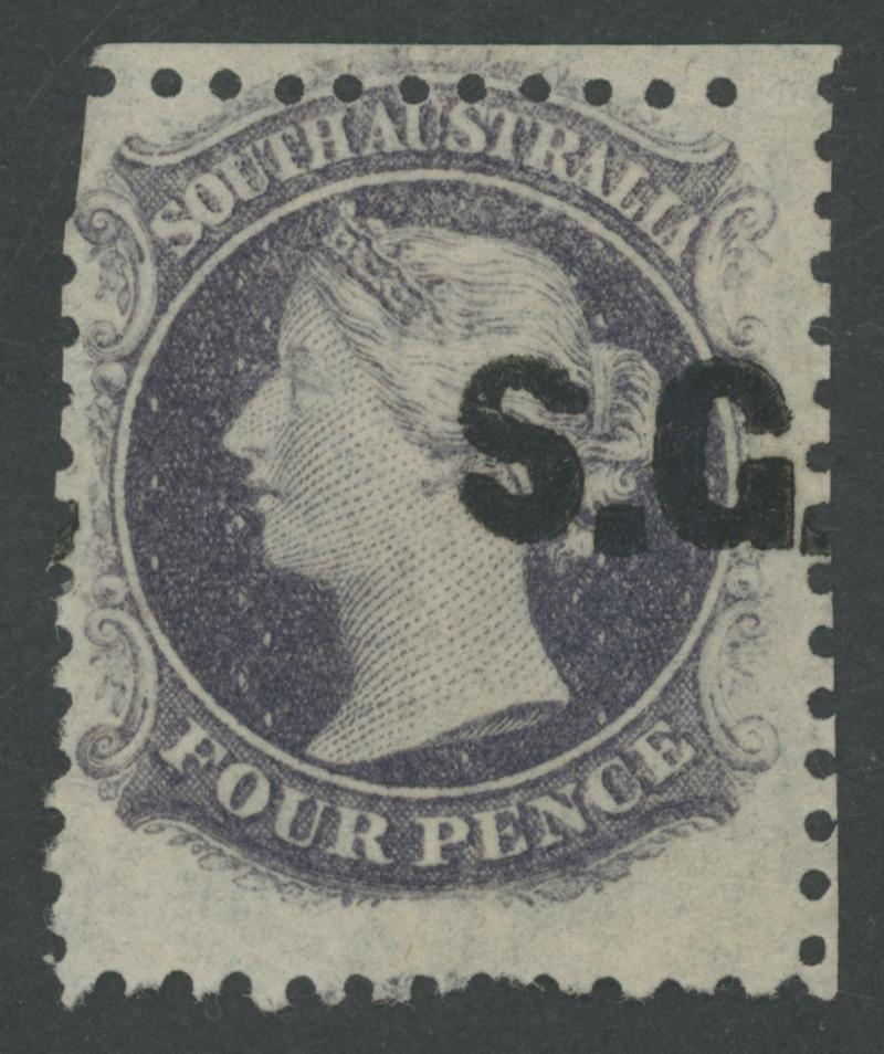 BLACK OVERPRINT: 'S.G.' on QV Perkins Bacon Large Star Wmk Perf 11½-12½ 4d dull violet SG DO509 with the Overprint Misplaced to