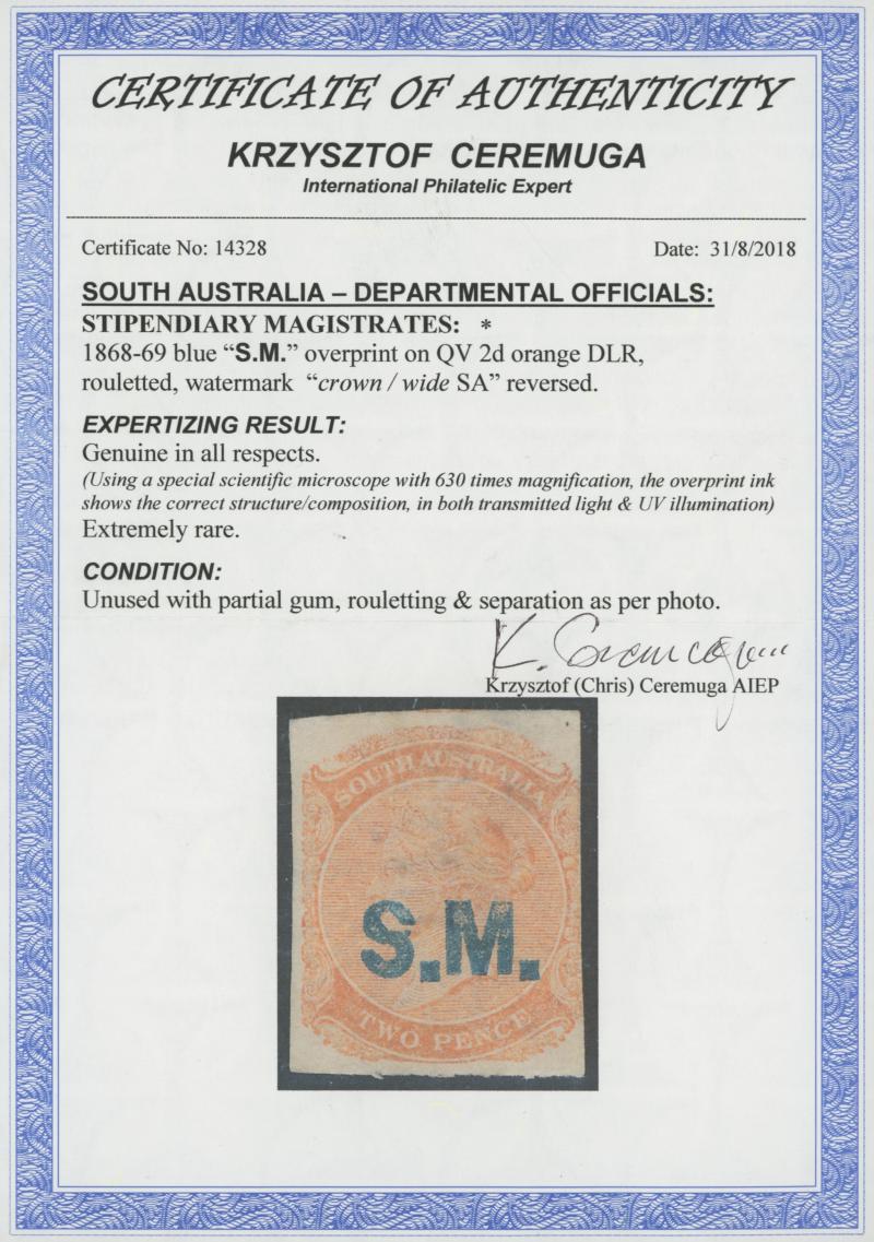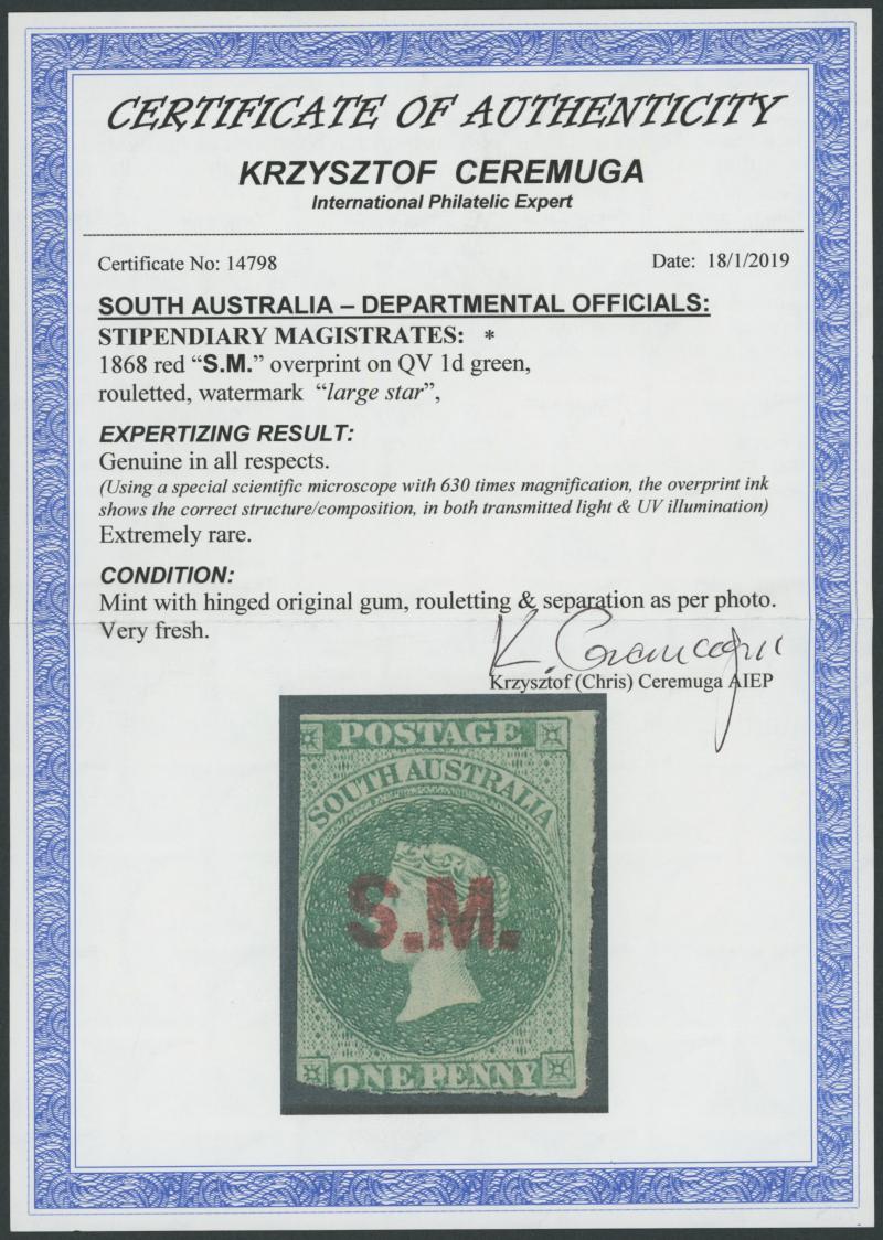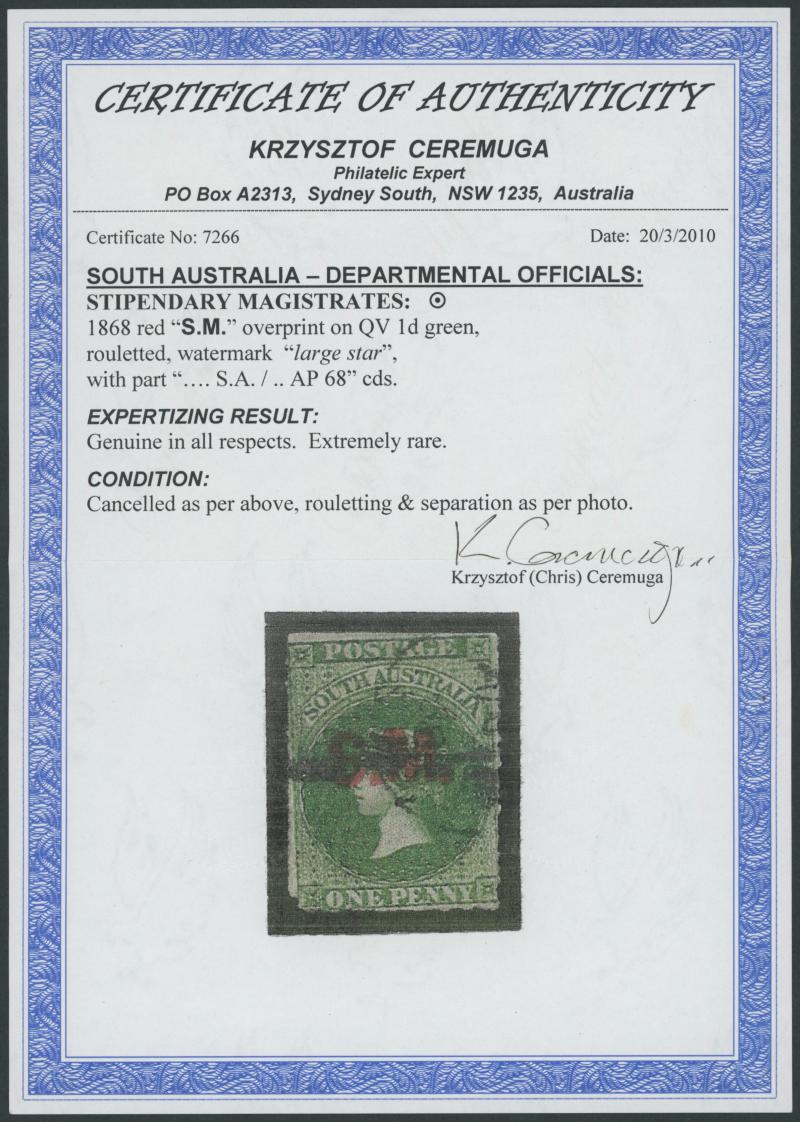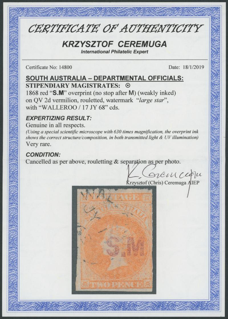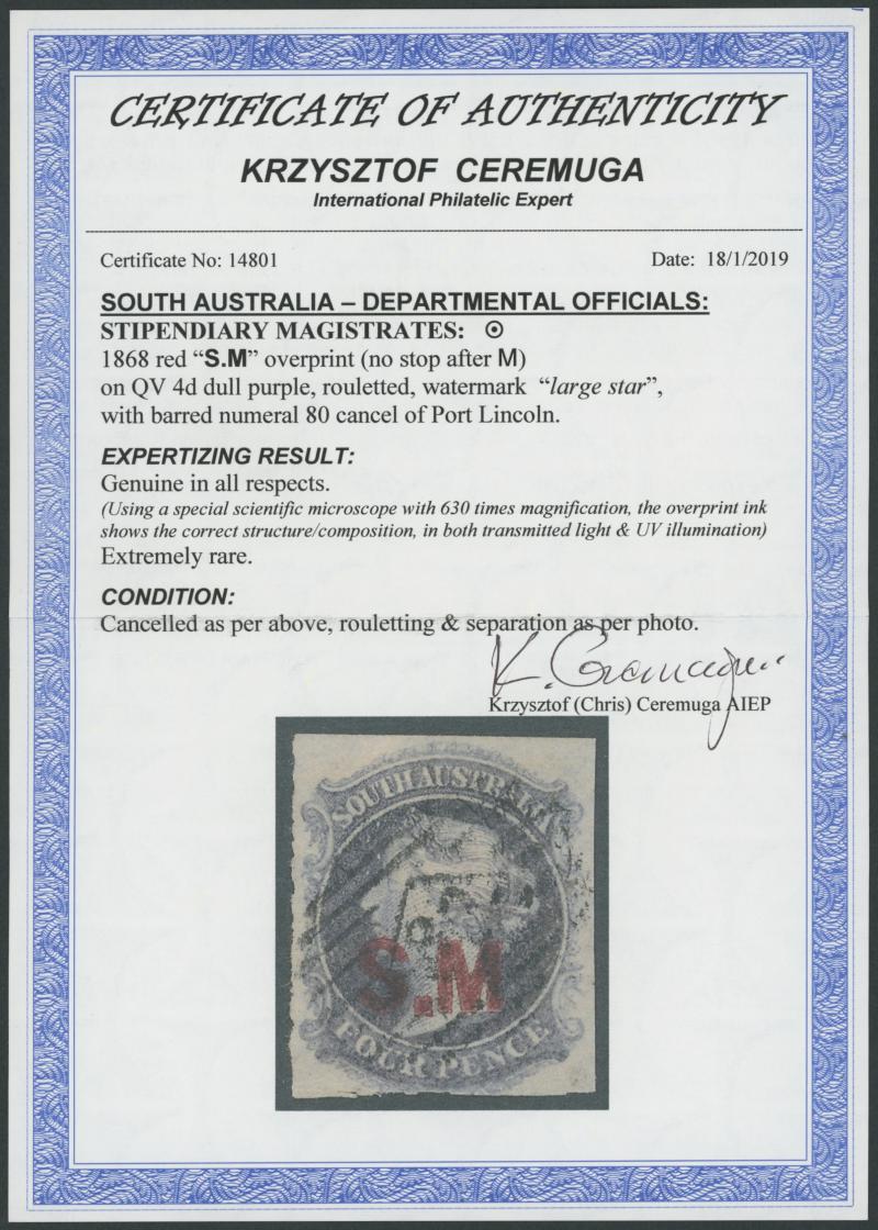 left and cut from the sheet clear of the design at left & base, light 'WALLAROO/JY17/68/SA' cds, Cat £200. Rated RRRR; unrecorded unused. Chris Ceremuga Certificate (2019) states "very rare". The very fine 'Besancon' and superb Don Pearce examples