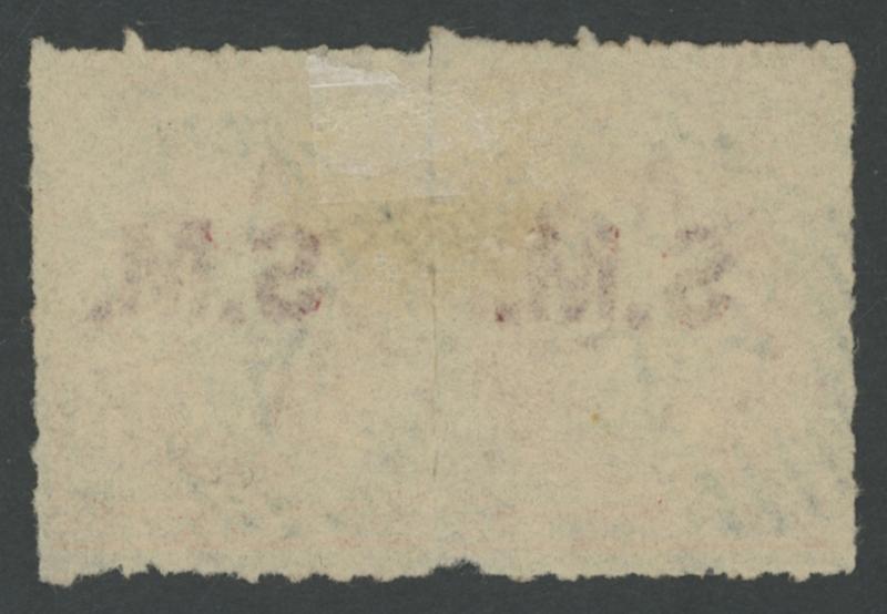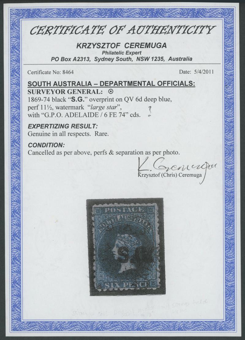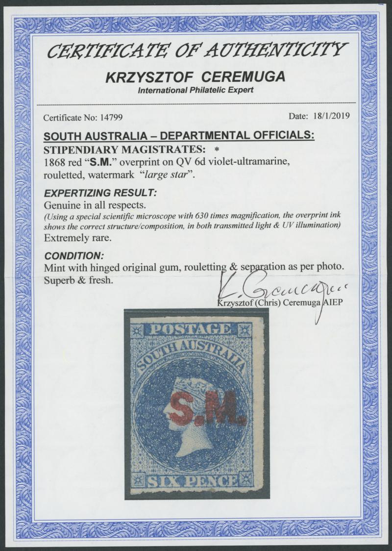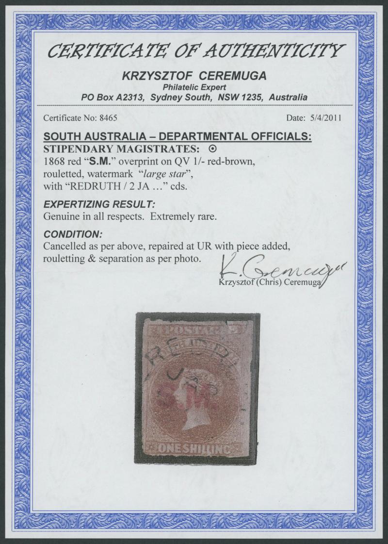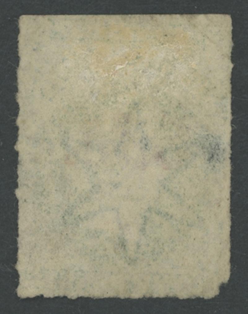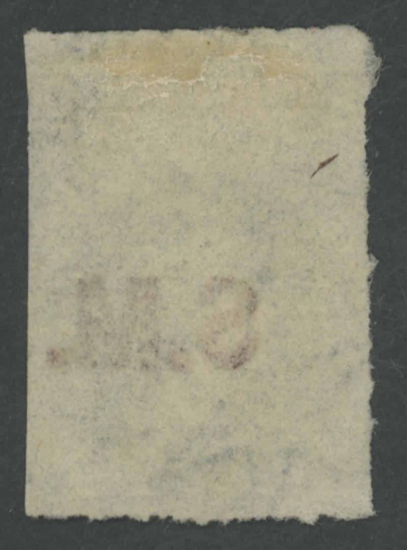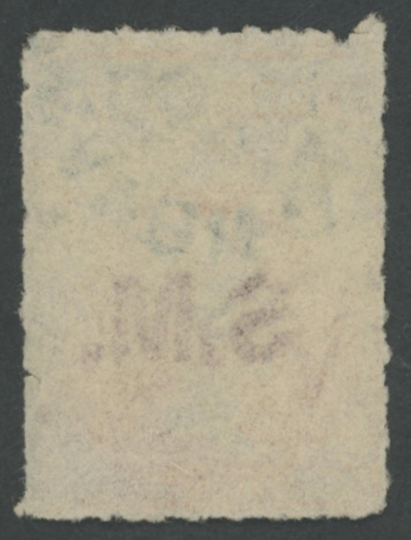 the sheet just clear of the design and misplaced horizontally resulting in 'SIX PENCE' at the top & the base, poor Gambierton cds, Cat £150. Rated RRR+. Ex 'Sir Humphrey' (Brian Farmer): sold for $670 (Sale 118 Lot 531). [Date range 23.6.1868 to