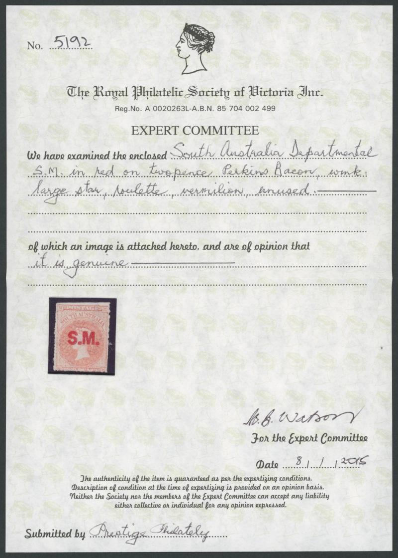 RED OVERPRINT: 'S.M.' on QV Perkins Bacon Large Star Wmk 2d vermilion SG DO518, rouletting except at the top where cut from the
