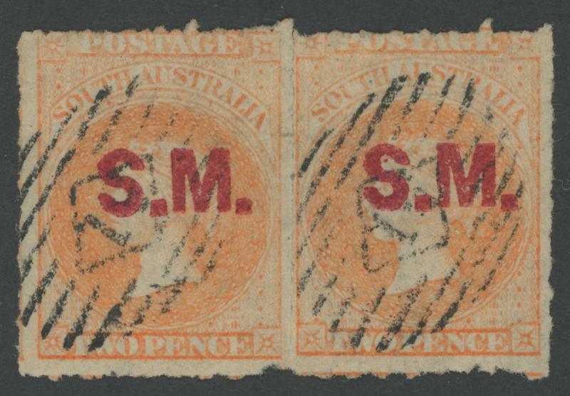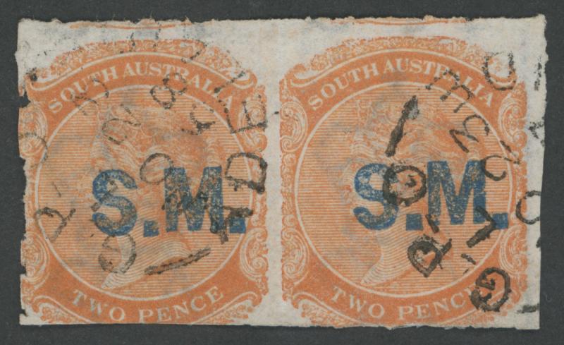 BLUE OVERPRINT: 'S.M.' on QV De La Rue Crown/SA Wmk Rouletted 2d red-orange SG DO524 with the Watermark Reversed, horizontal pair