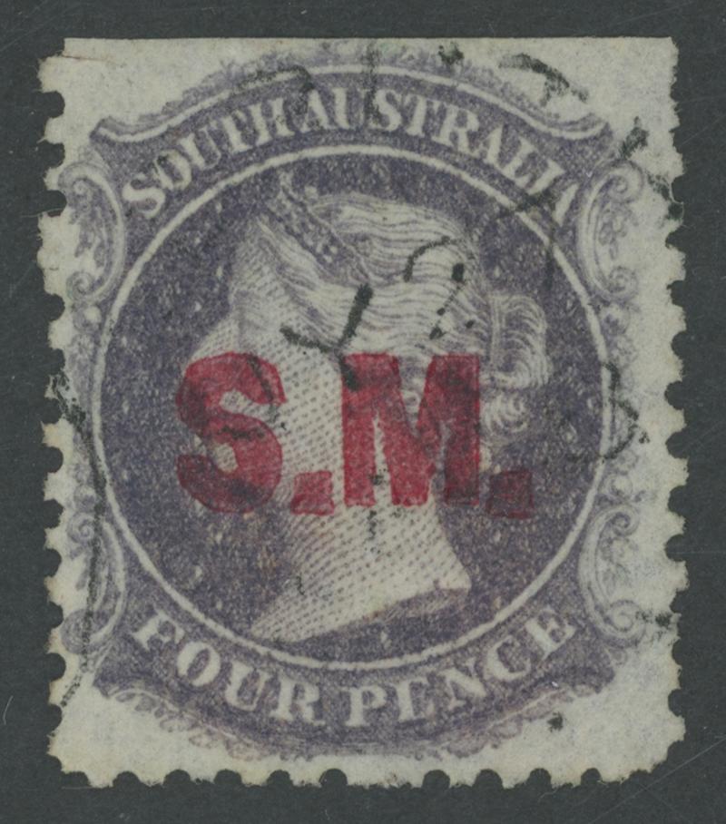 RED OVERPRINT: 'S.M.' on QV Perkins Bacon Large Star Wmk Perf 11½-12½ 4d dull purple SG DO522, perfs trimmed clear of the design at