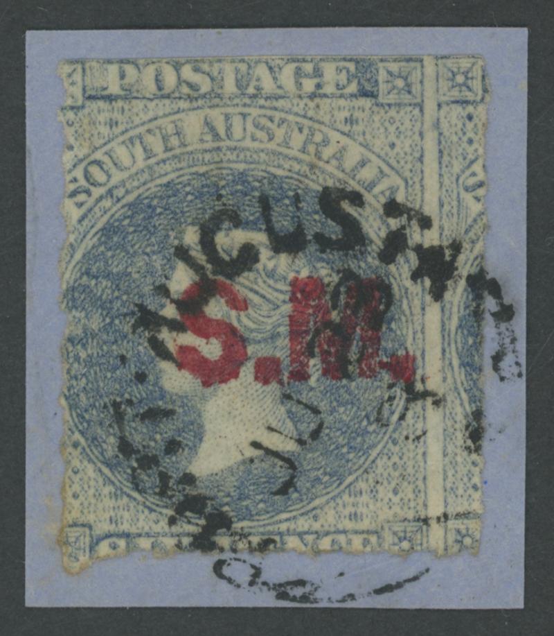 sheet just clear of the design at the top, tied to small piece by 'PORT-AUGUSTA/JU23/68/S.A' cds, Cat £150. Rated RRR. Ex Don Pearce: sold for $276 (Sale 247 Lot 723). The creased 'Besancon' example sold for SFr121. [Date range 23.6.1868 to 11.8.1868