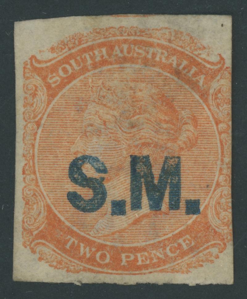 BLUE OVERPRINT: 'S.M.' on QV De La Rue Crown/SA Wmk Rouletted 2d dull orange SG DO524, rouletting at the base only and otherwise
