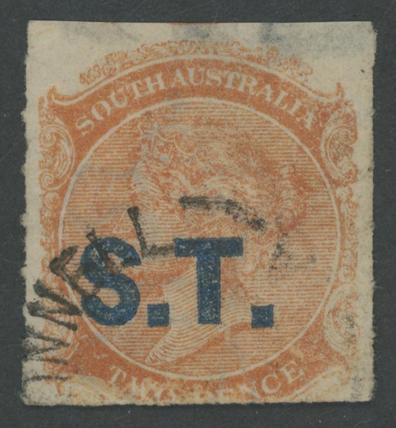 BLUE OVERPRINT: 'S.T.' on QV De La Rue Crown/SA Wmk Rouletted 2d pale orange SG DO546, rouletting except at top where cut from the