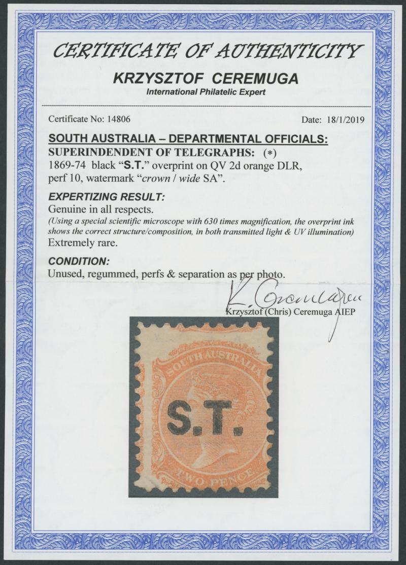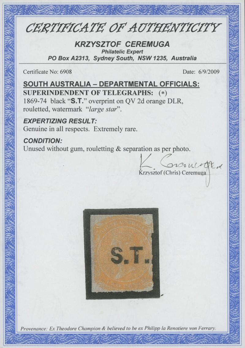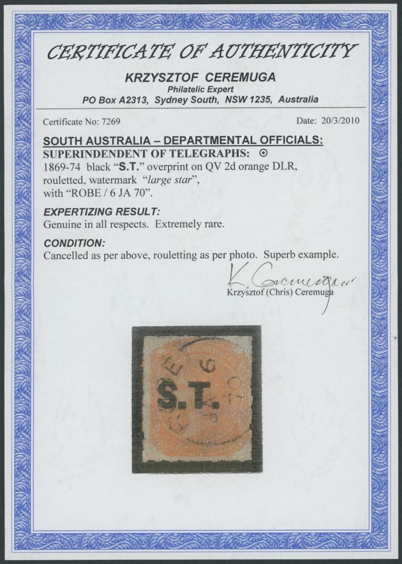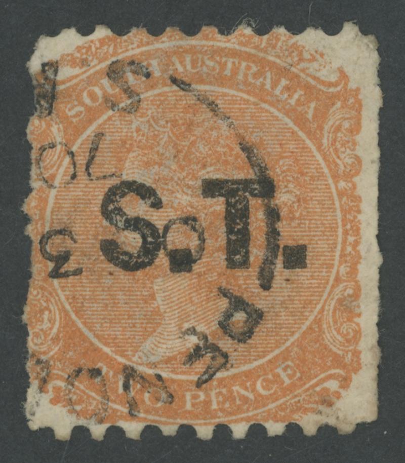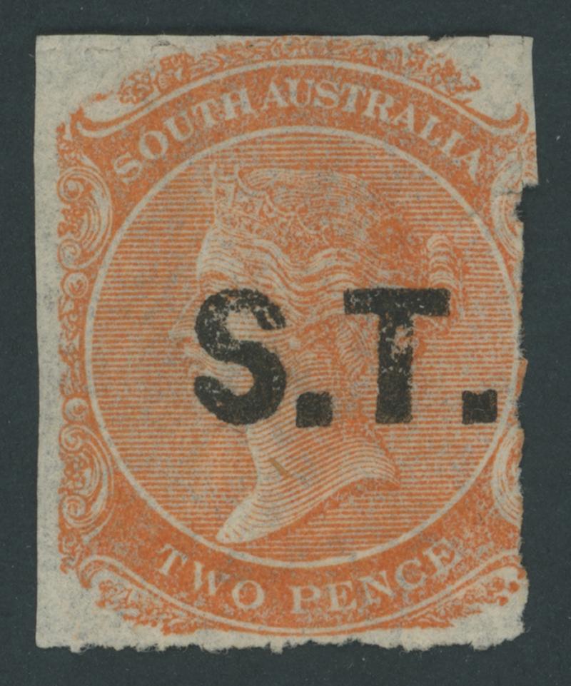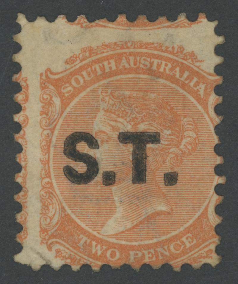 BLACK OVERPRINT: 'S.T.' on QV De La Rue Crown/SA Wmk Rouletted 2d orange SG DO547 with the Watermark Reversed, rouletting on all