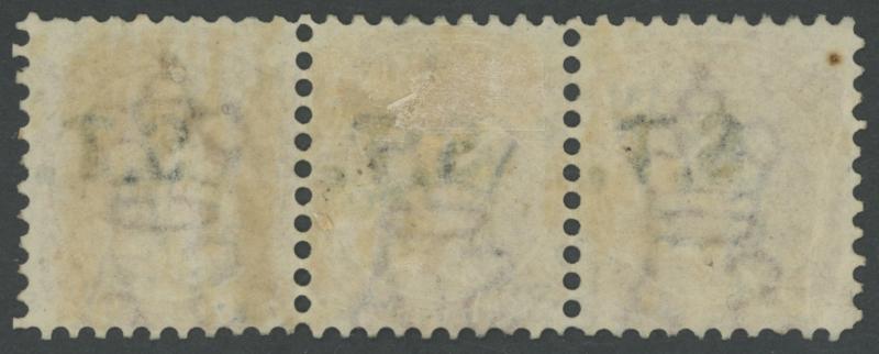 BLACK OVERPRINT: 'S.T.' on QV De La Rue Crown/SA Wmk Perf 10 2d dull red-orange SG DO550 horizontal strip of 3,