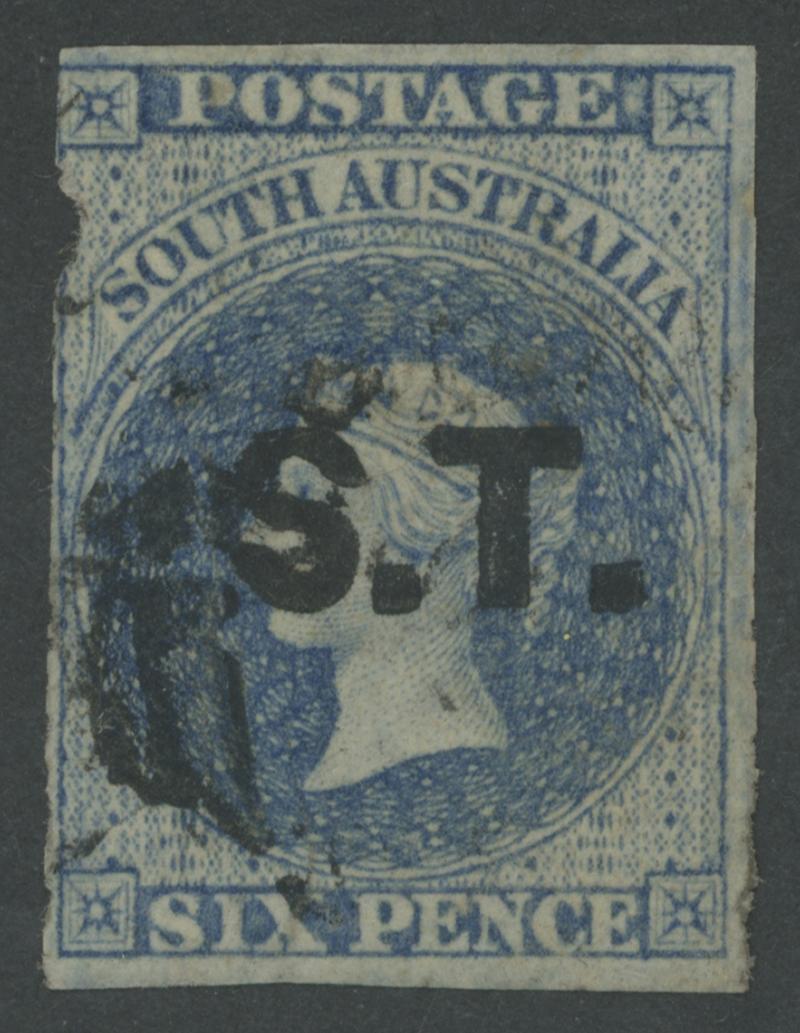 BLACK OVERPRINT: 'S.T ' (No Stop after 'T ') on QV Perkins Large Star Wmk Rouletted 6d dull blue SG DO548a, rouletting on all