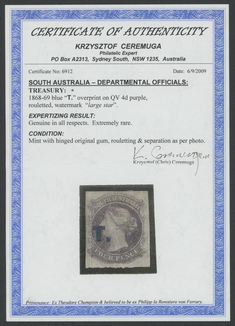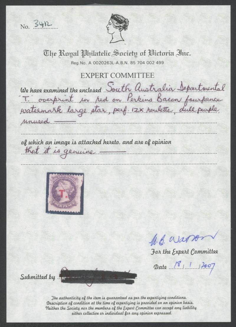 RED OVERPRINT: 'T.' on QV Perkins Bacon Large Star Wmk Perf 11½-12½xRouletted 4d deep purple SG DO555, large-part gum with a couple