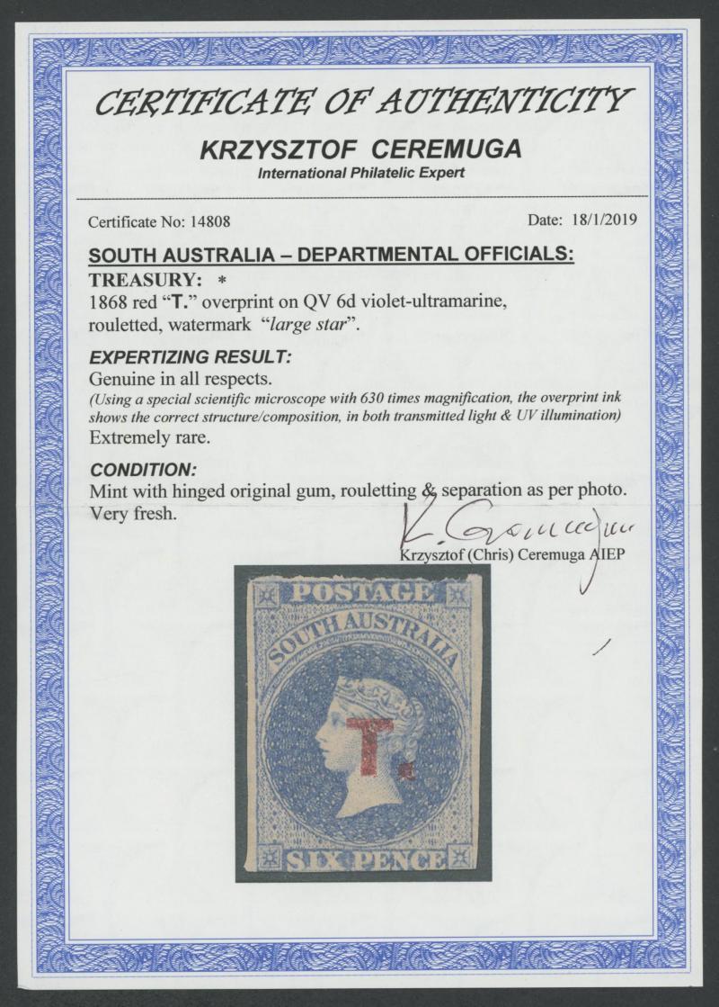 rouletting on all sides, ironed-out horizontal crease, very fine GPO cds of 'DE21/68', Cat £650. Rated RRR. More attractive than Don Pearce's example - graded 'A-' - that sold for $1135 (Sale 247 Lot 804). Absent from the Vestey, 'Besancon' and
