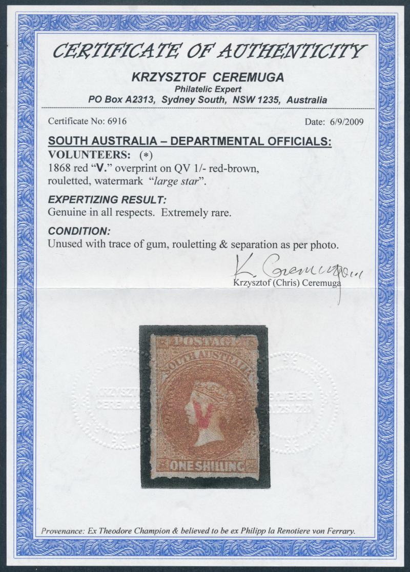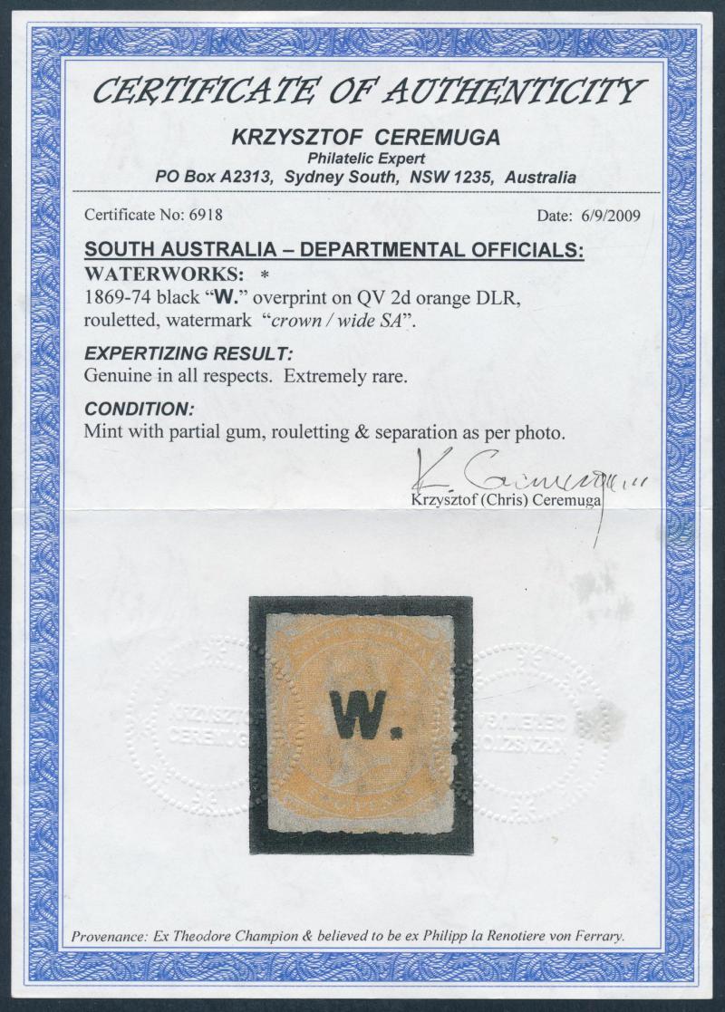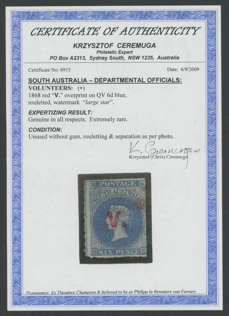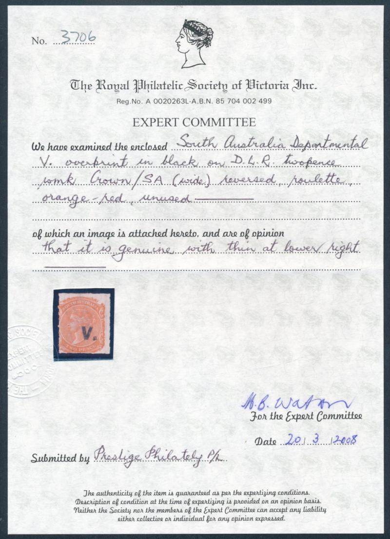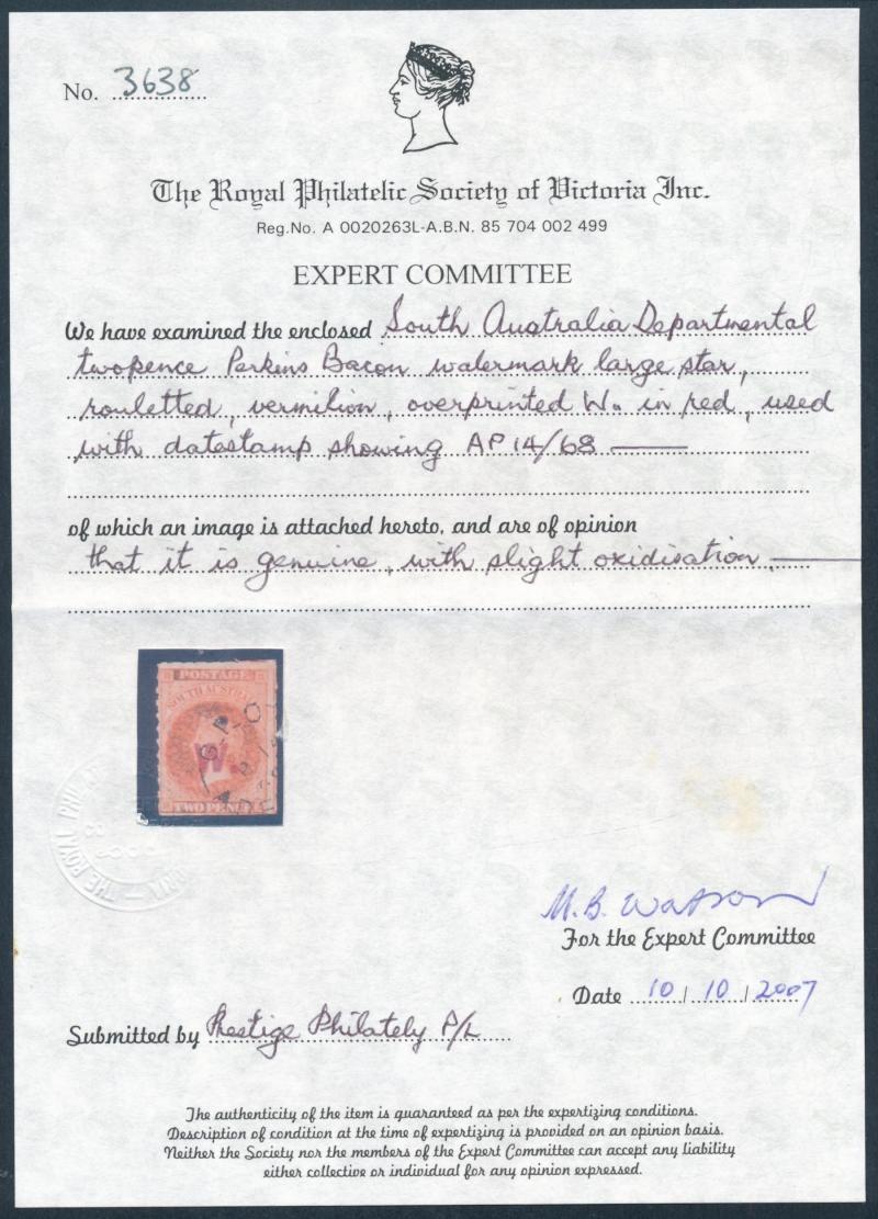 This is the Holy Grail for collectors of the South Australian Departmentals. Four examples have been recorded. Reverend EP Raynor owned an example: it has not been seen since 1965 and may no longer be extant. The location of AE Fryar's example -