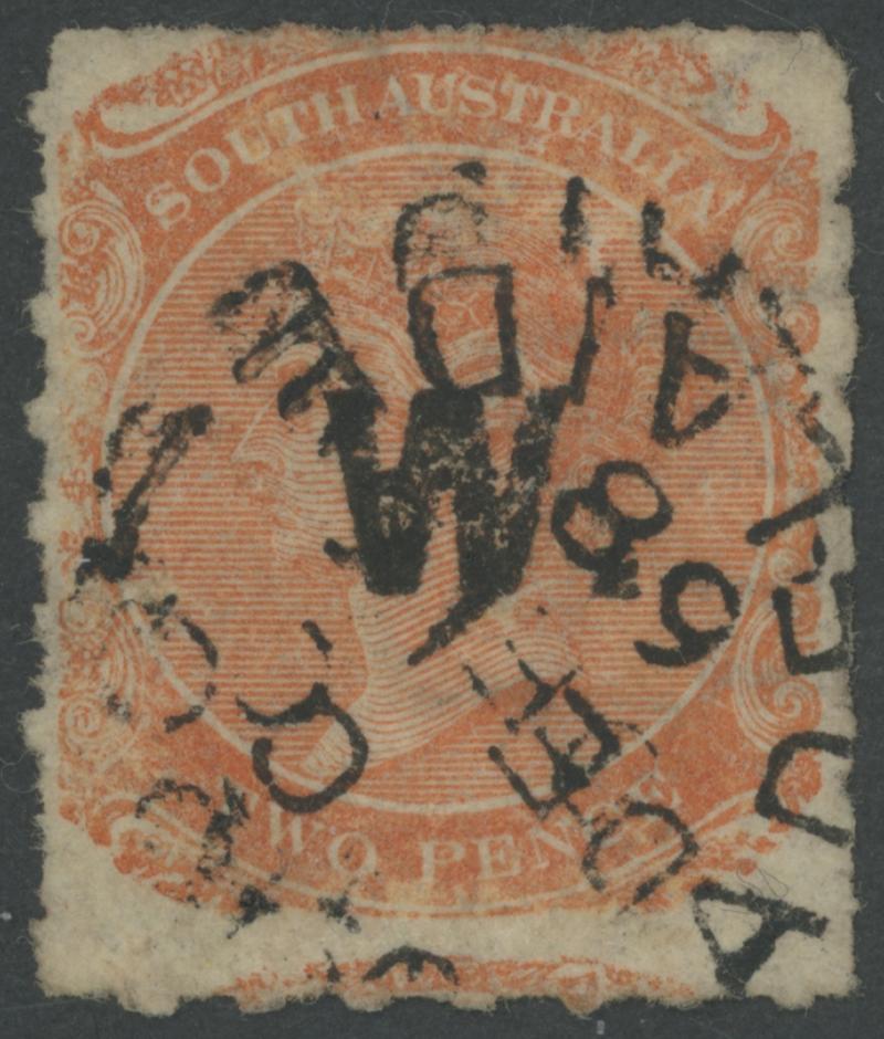 BLACK OVERPRINT: 'W.' on QV De La Rue Crown/SA Wmk Rouletted 2d dull orange SG DO589, rouletting except at left where cut from the