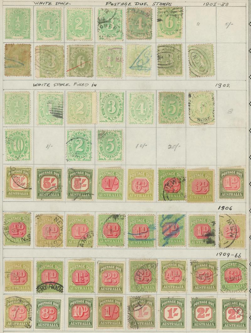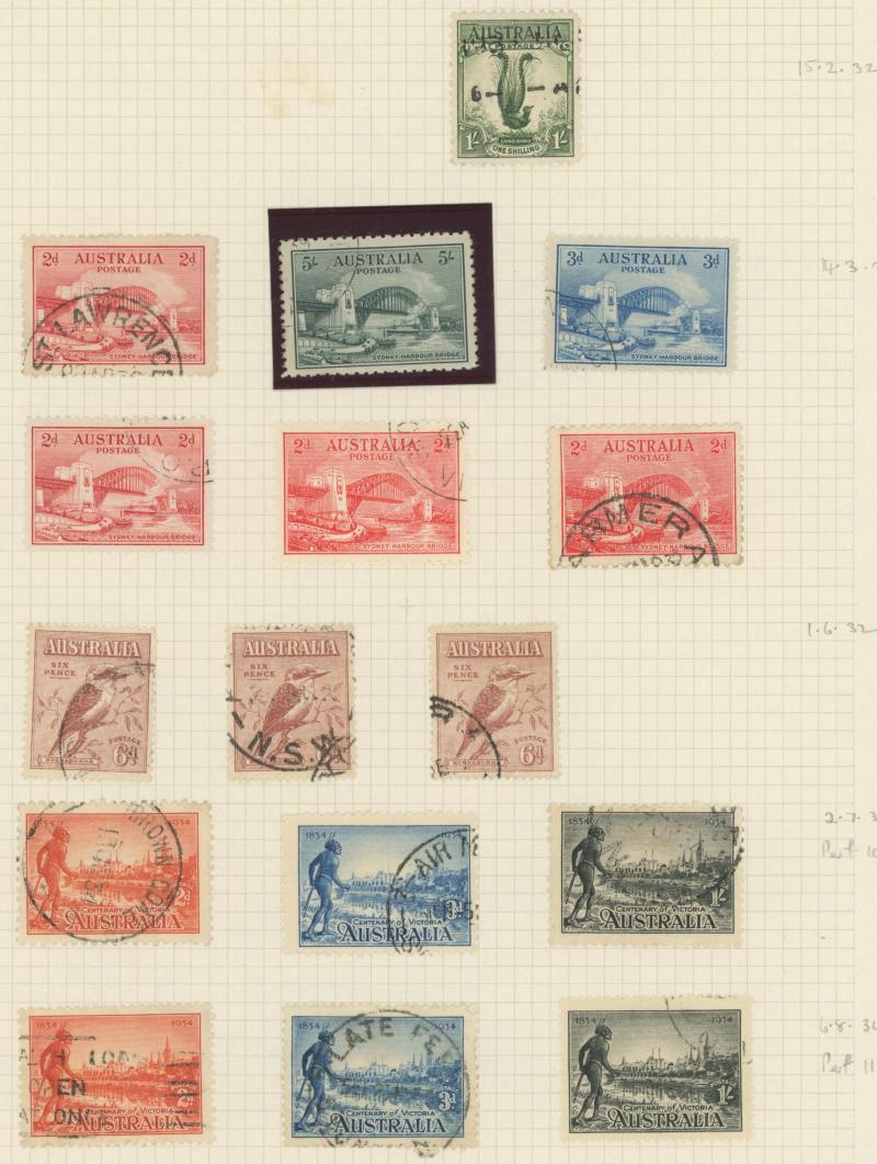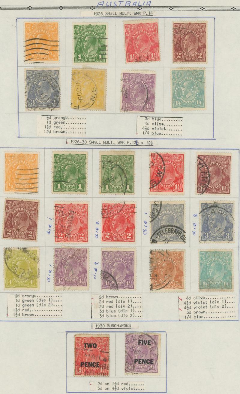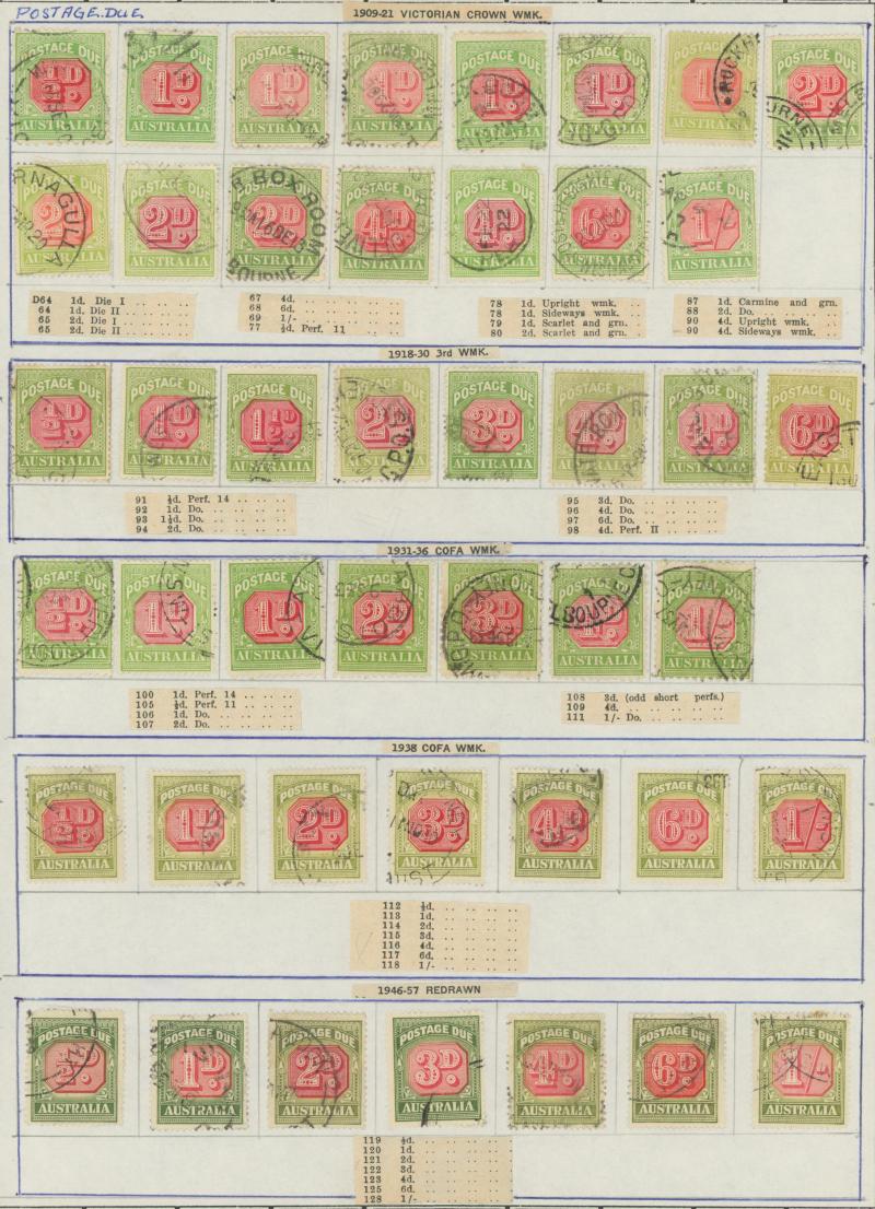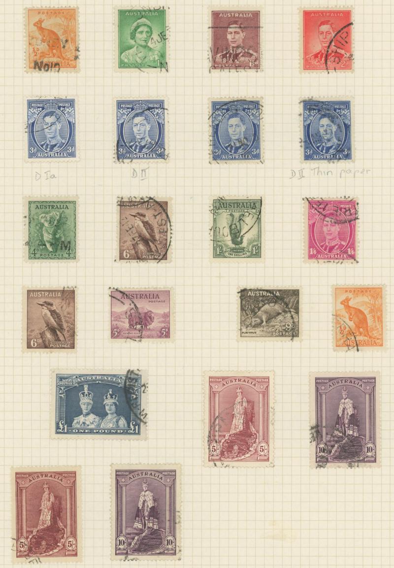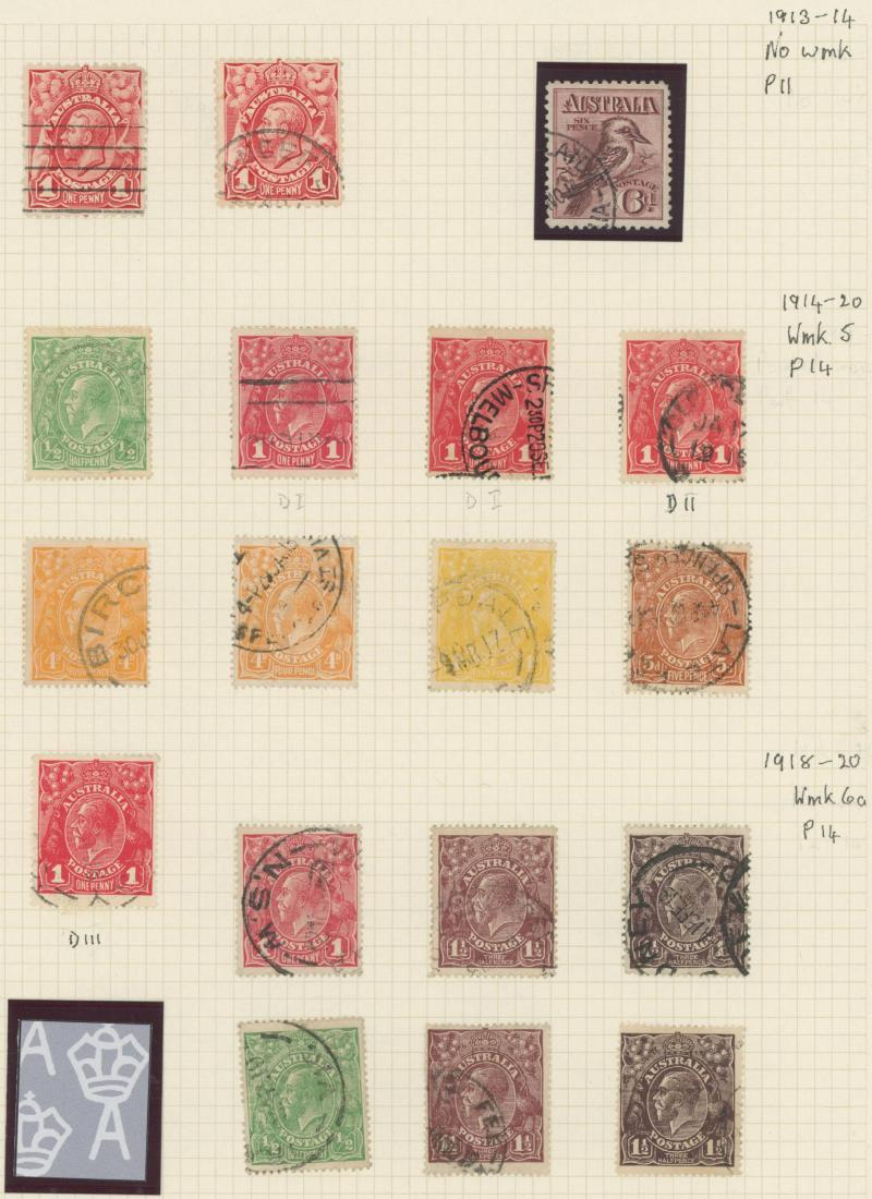 used noted Engraved 6d Kookaburra * & used, KGV Commemoratives range to 2/- (no 5/- Bridge), a few Postage Dues, the later issues to 1970s incomplete, potential for further varieties to be found, definite postmark interest especially amongst the