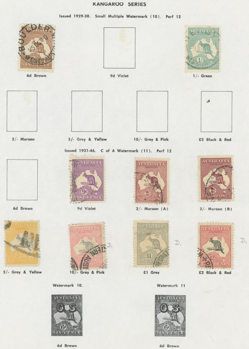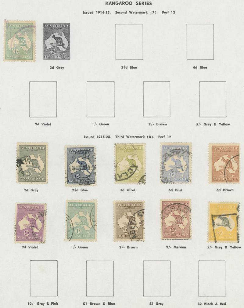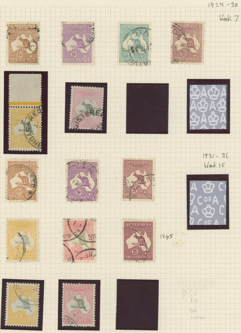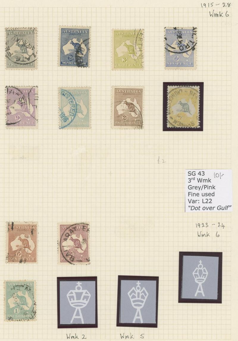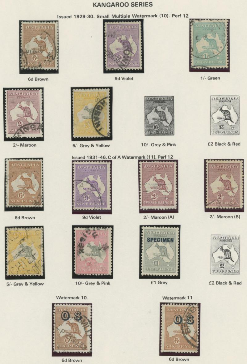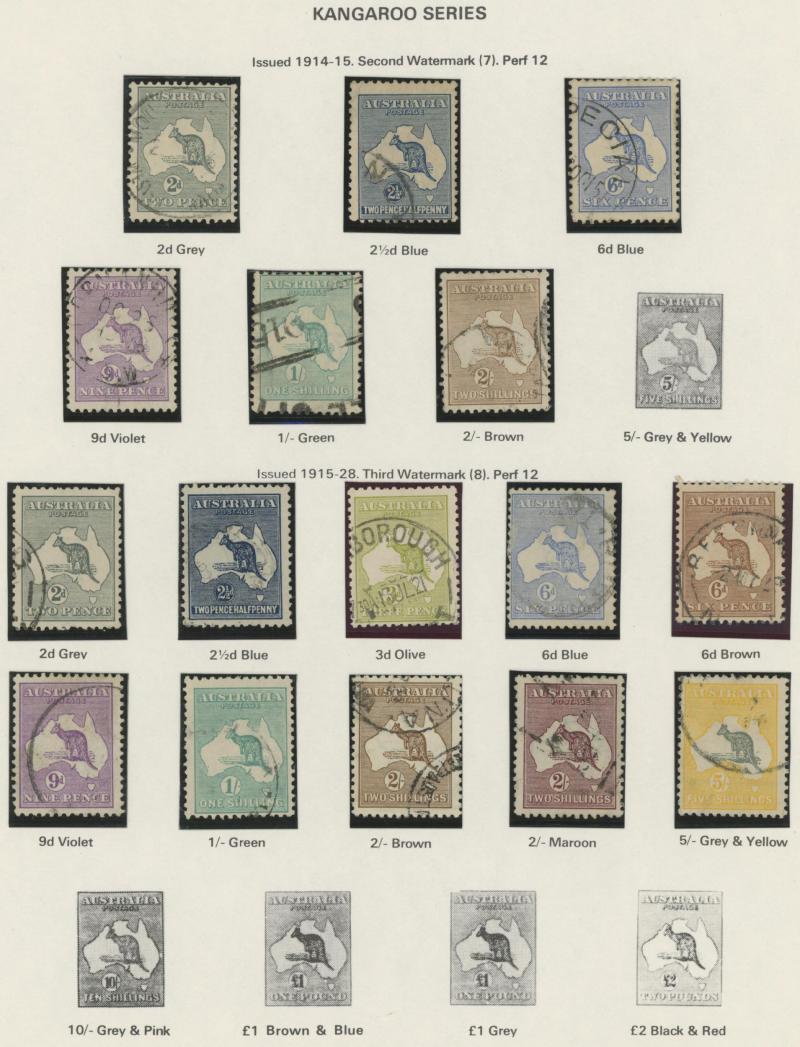 Collection predominantly used on Seven Seas pages from Kangaroos range including Third Wmk to 5/- and CofA Wmk £1 & £2 (both with