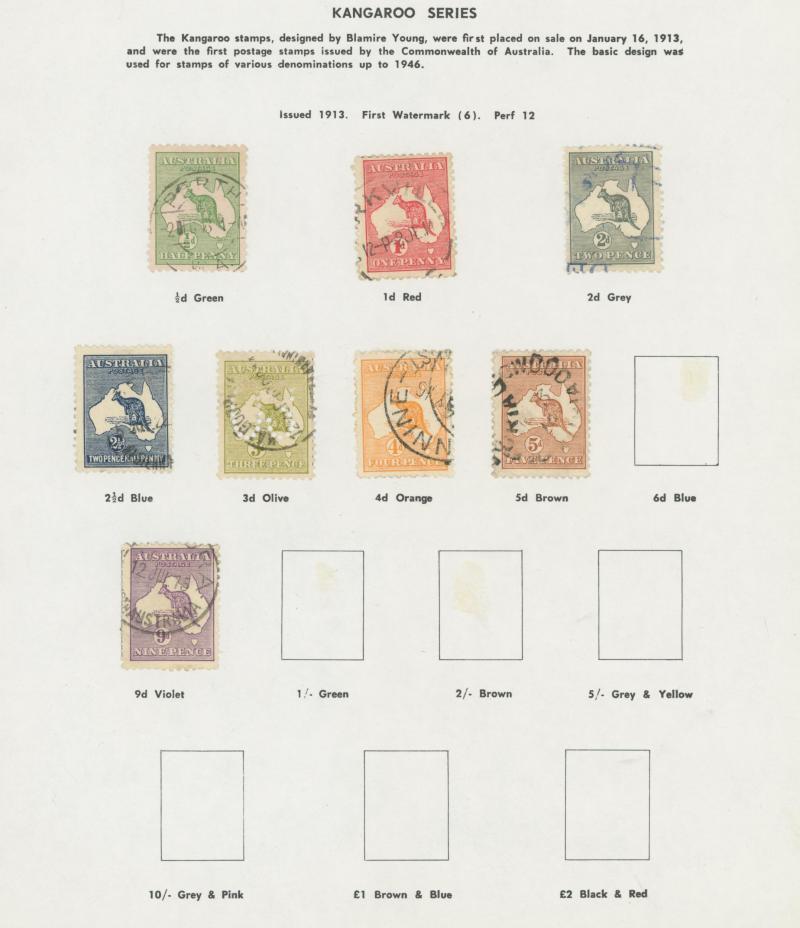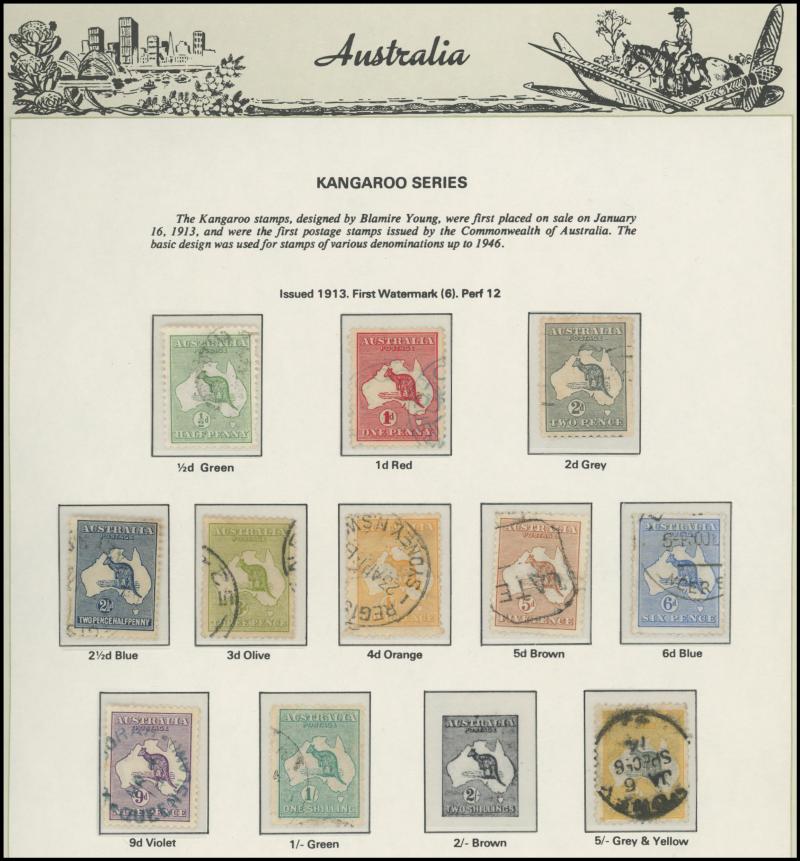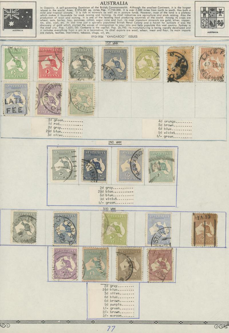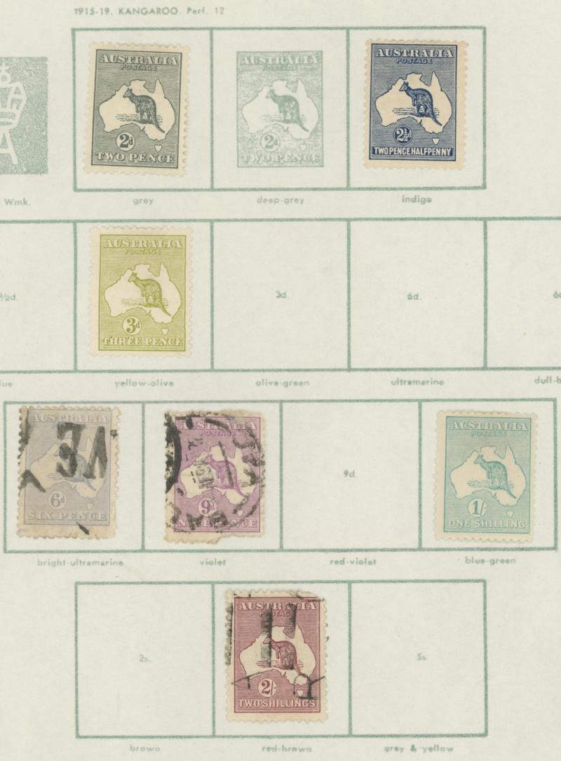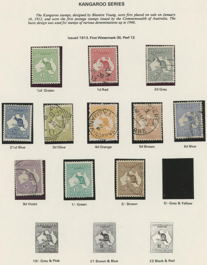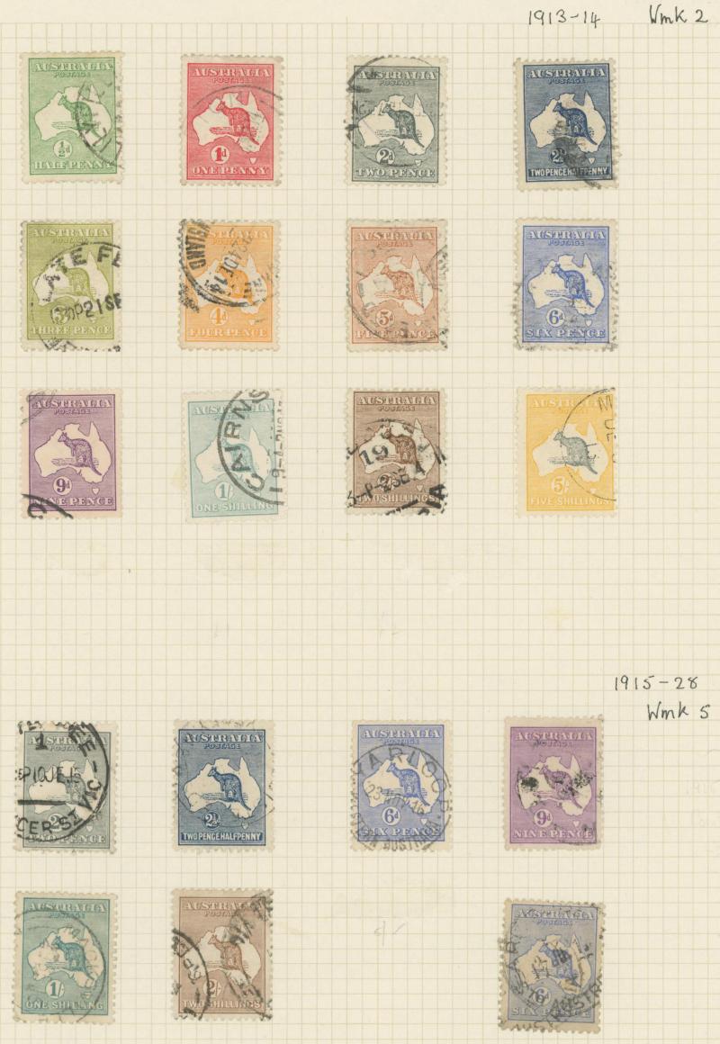 Collection predominantly used on Seven Seas pages from Kangaroos range including Third Wmk to 5/- and CofA Wmk £1 & £2 (both with