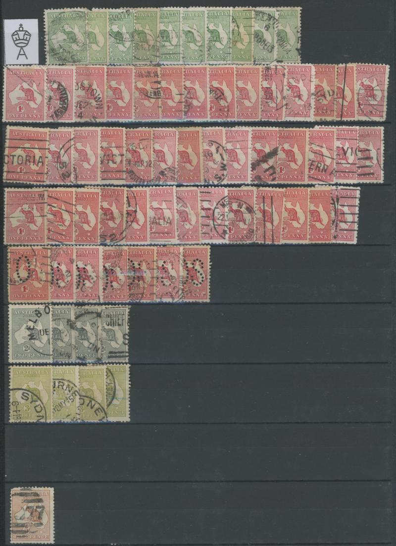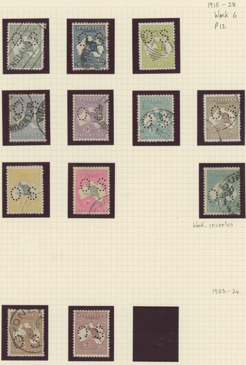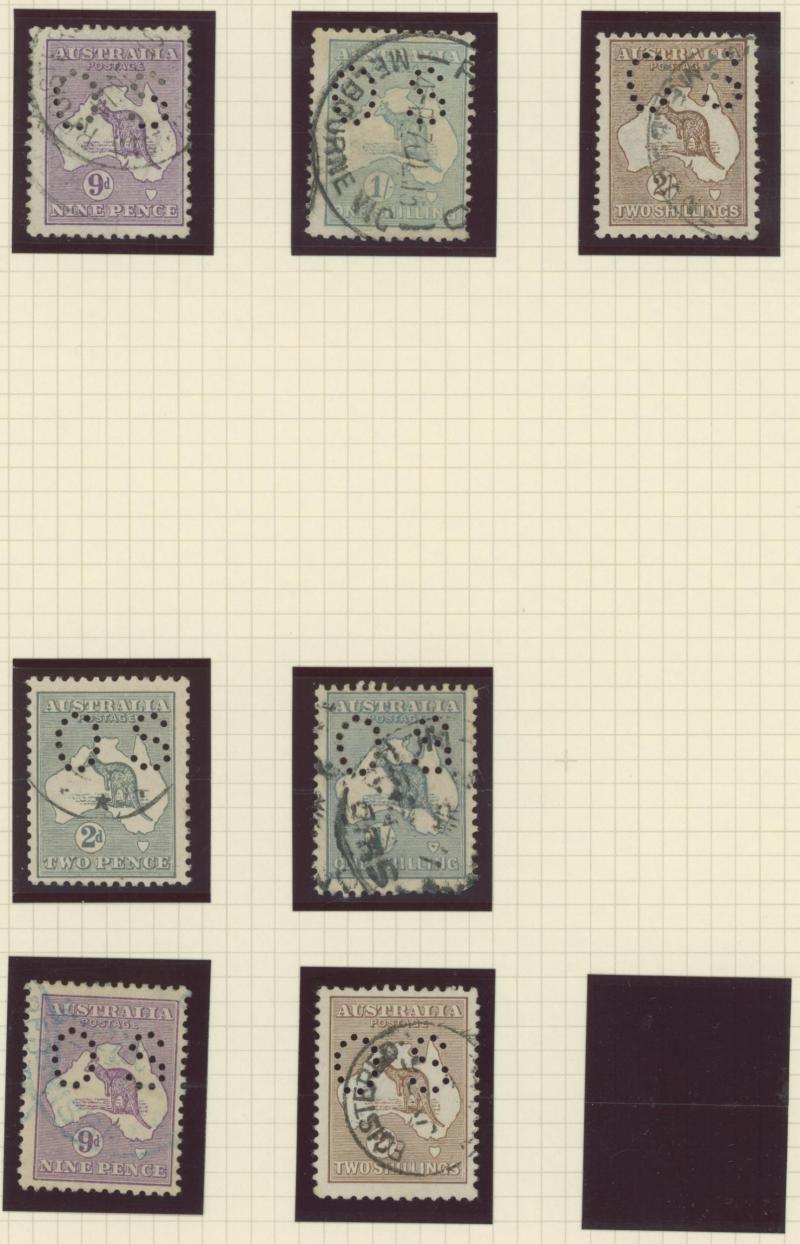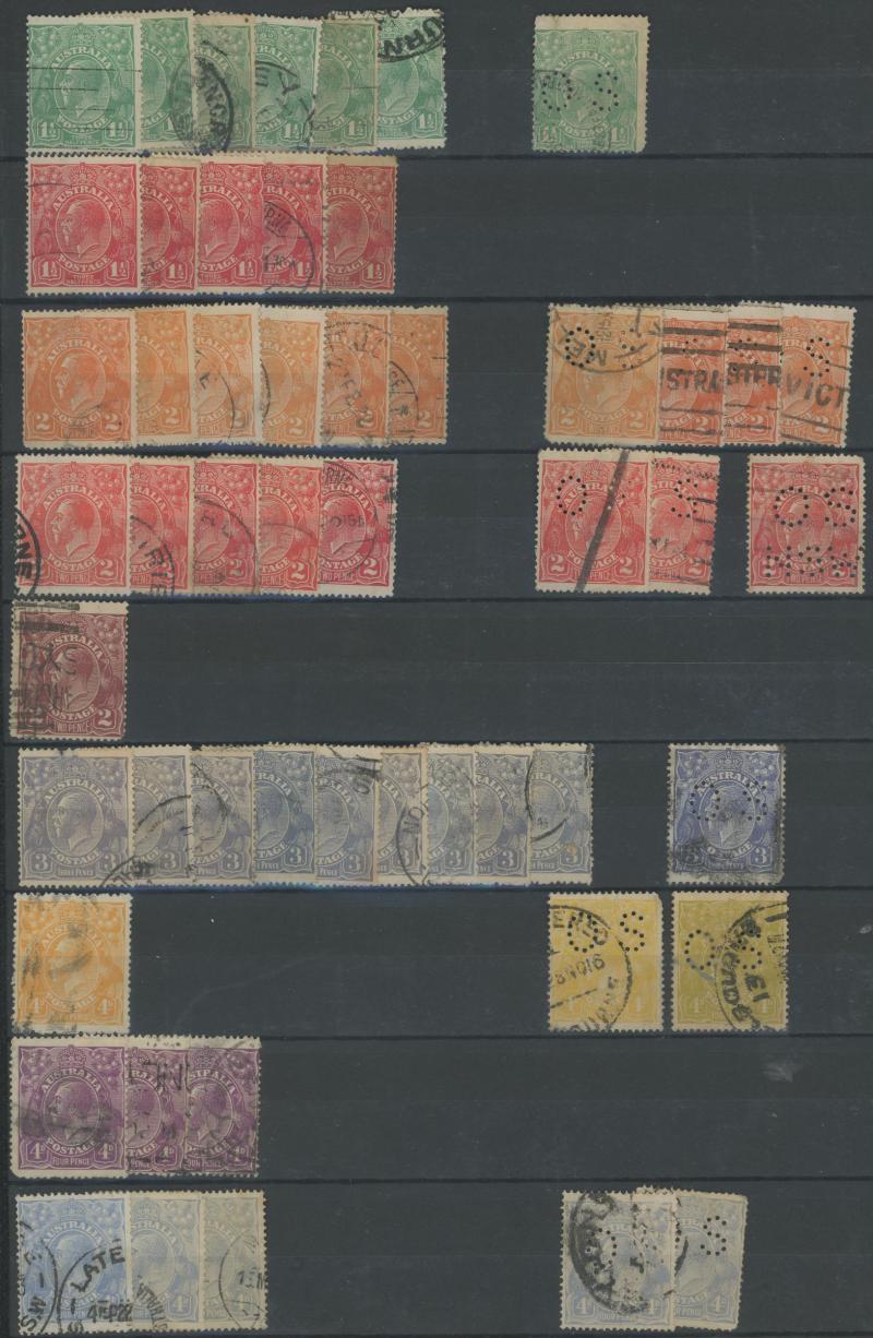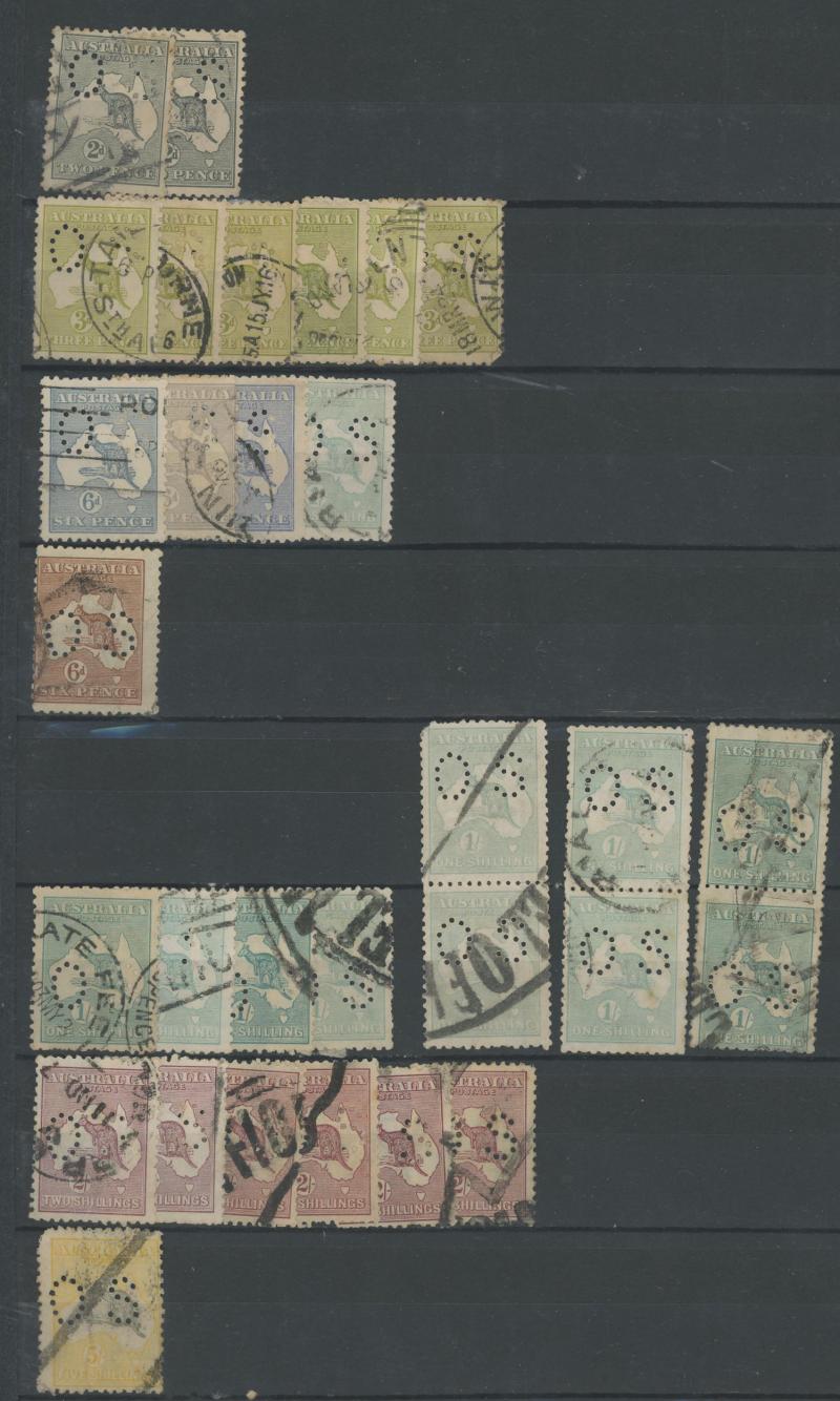 punctured 'OS' used, then Kangaroos range to First Wmk 5/-, Second Wmk 5/- & Third Wmk 5/- used, KGV Heads including 5d Rough Paper chestnut punctured 'OS', Single Wmk 4d orange x2, 4d lemon, 4d blue Inverted Watermark & 1/4d blue all * plus plenty
