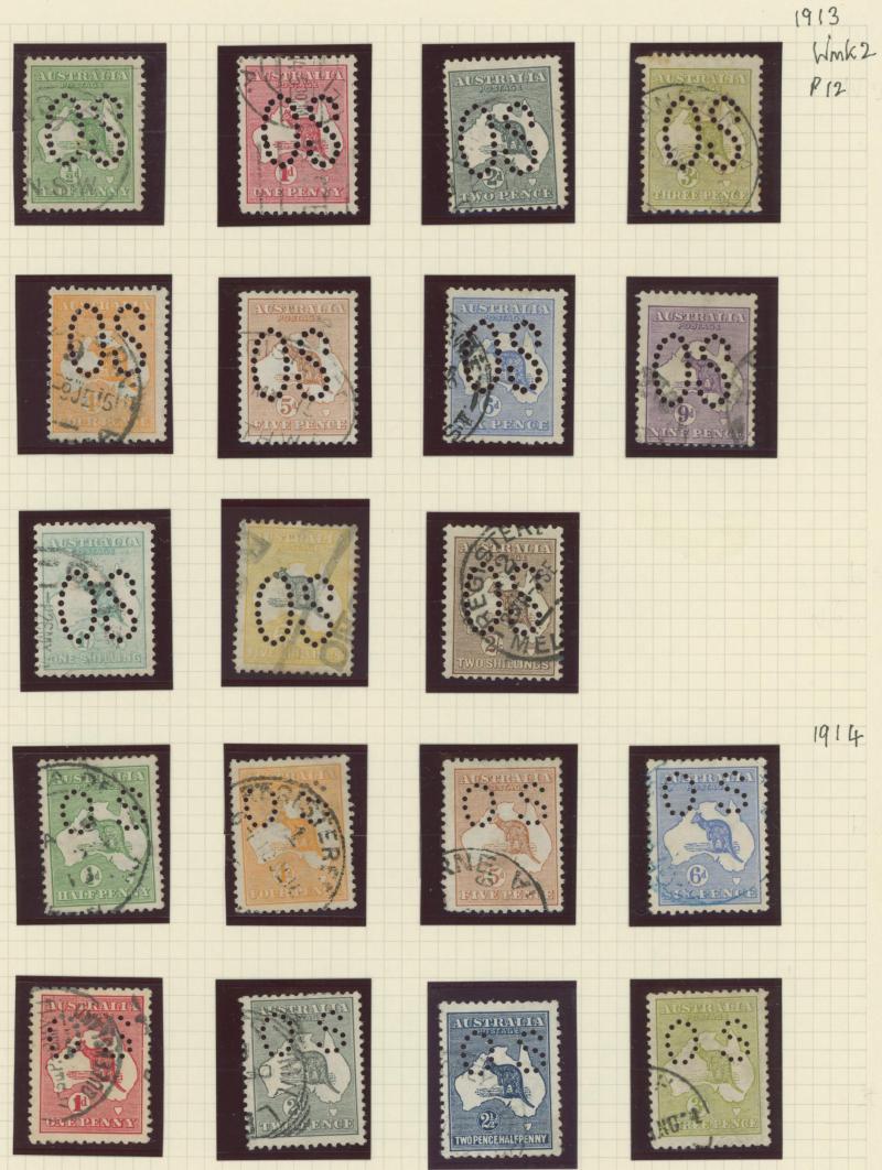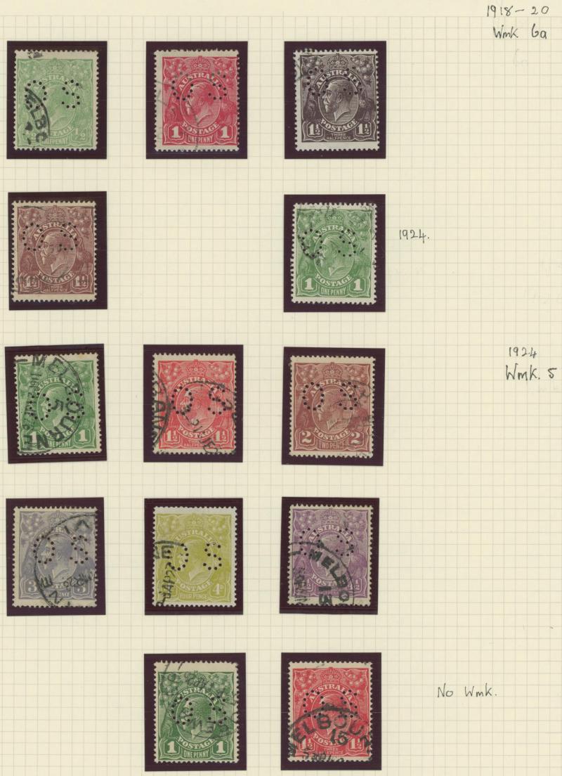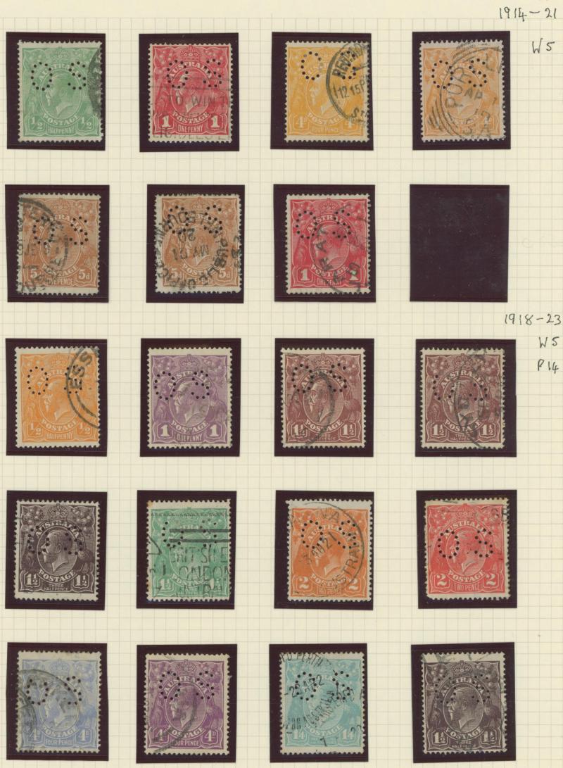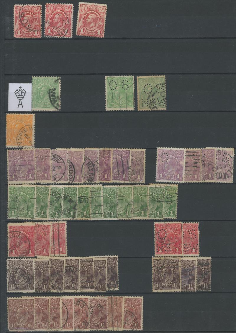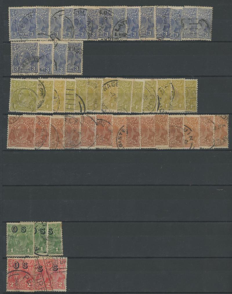punctured 'OS' used, then Kangaroos range to First Wmk 5/-, Second Wmk 5/- & Third Wmk 5/- used, KGV Heads including 5d Rough Paper chestnut punctured 'OS', Single Wmk 4d orange x2, 4d lemon, 4d blue Inverted Watermark & 1/4d blue all * plus plenty